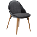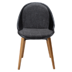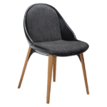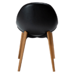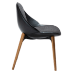 Stol ima umetniško zaobljeno naslonjalo, ki se nadaljuje v sedež kot odprta školjka ter vabi in ponuja udobno sedenje. Sedež je postavljen na kovinsko ogrodje z elegantnimi nogicami iz jesenovega lesa rjave barve, ki se nežno raztezajo navzgor, kar mu daje edinstven in eleganten videz. Sedišče in naslonjalo sta oblazinjena v vintage črno bukle blago, hrbtišče pa v črno eko usnje.