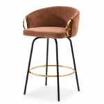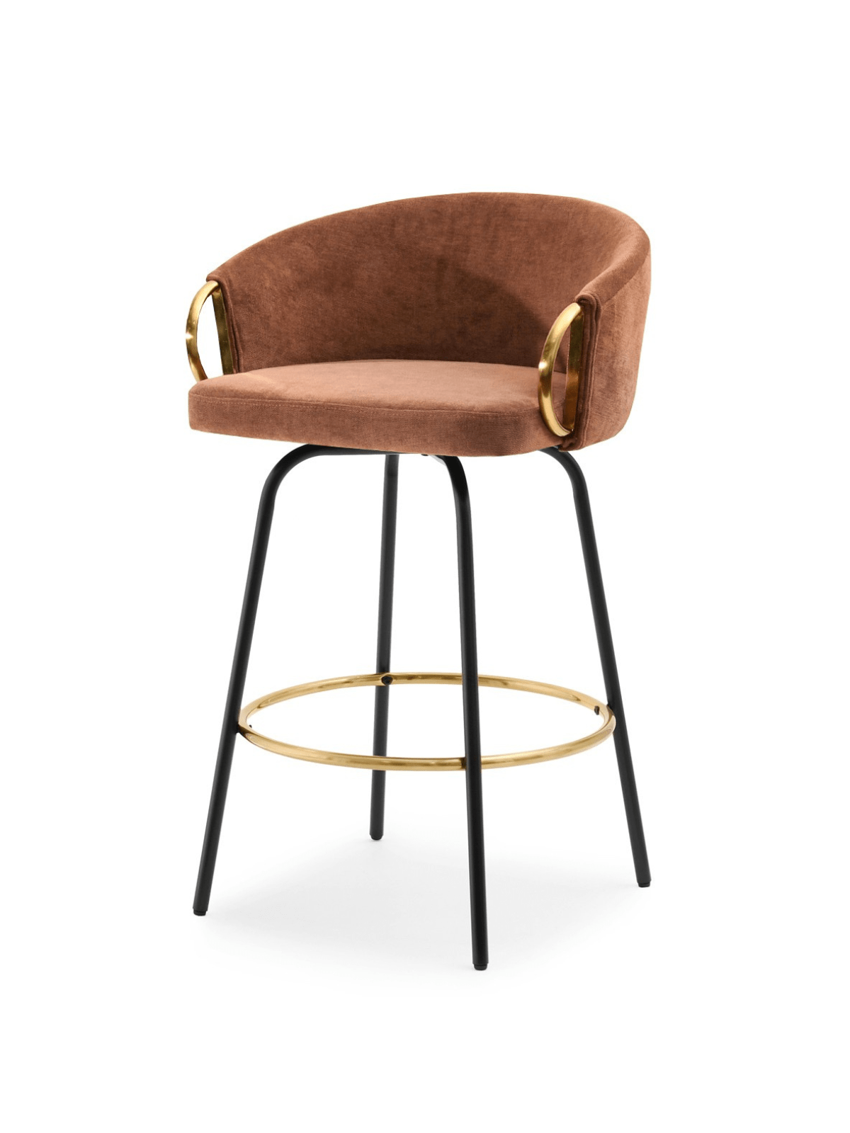 Barski stol Claire je eleganten model, ki ga prepoznamo po diskretnih ročajih za premikanje, ki so vgrajeni v naslonjala za roke, ter strukturni tkanini. Konstrukcija je črno-zlata, kar v kombinaciji z mehkimi materiali daje stolu dodaten sijaj.