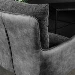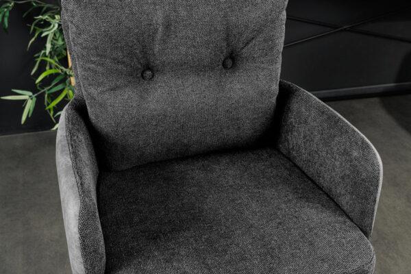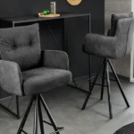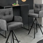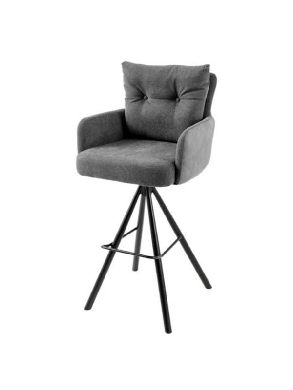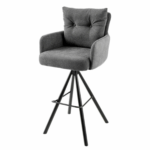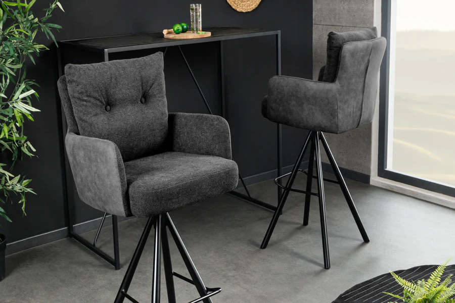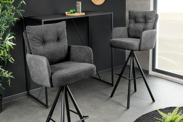 Barski stol Conrad združuje udobje in brezčasno industrijsko oblikovanje. Notranje površine sedeža, naslonov za roke in hrbtišča so prevlečene s teksturirano tkanino, ki je prijetna na dotik in zagotavlja udobje tudi med dolgotrajnim sedenjem. Zunanji deli so oblazinjeni z mehkim sijočim žametom v enakem tonu, kar ustvarja subtilen materialni kontrast in vizualno globino.
