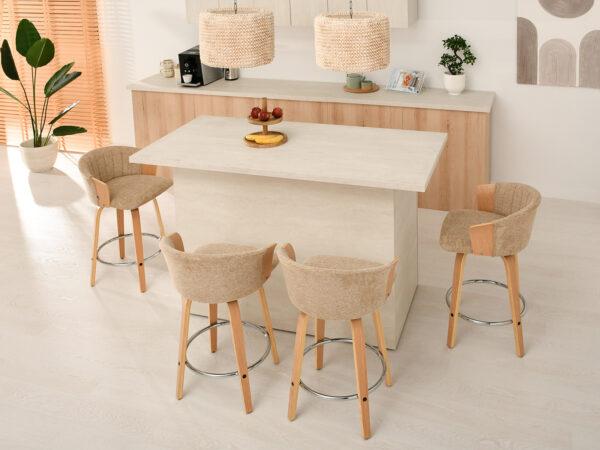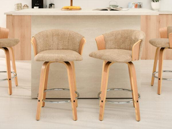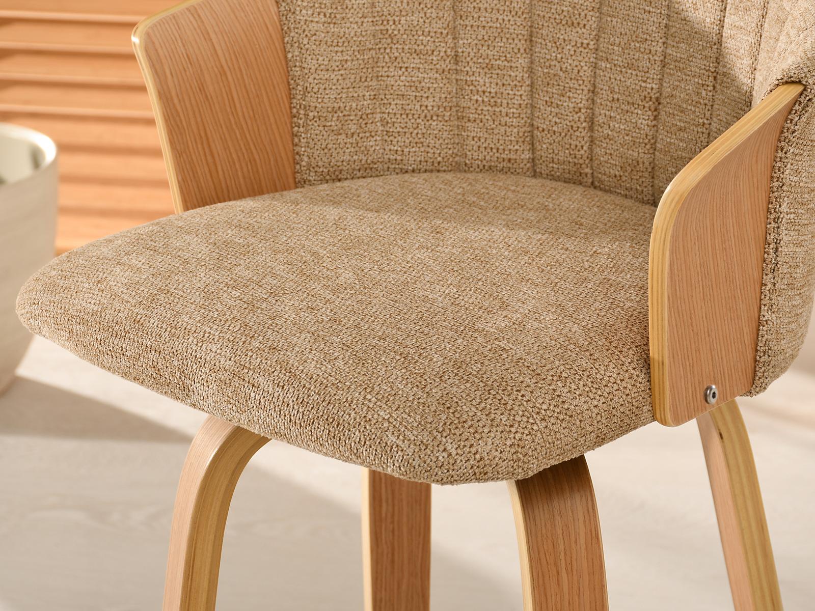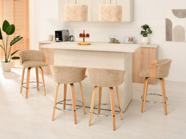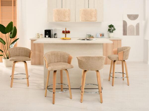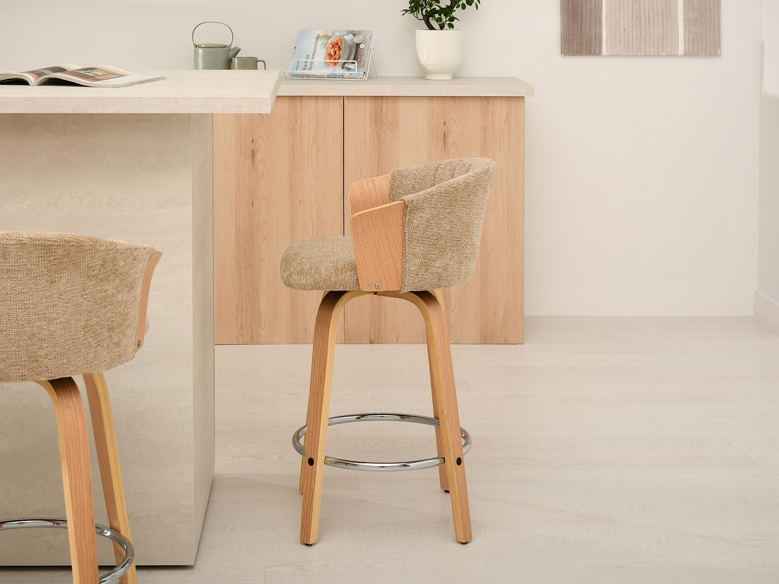 Polbarski stol Kiran je edinstven dodatek k vsaki kuhinji. Zaradi svoje kompaktne velikosti je idealen za manjše prostore, kot so kotički za zajtrk ali majhne čajne kuhinje. Naravna lesena površina doda toplino in eleganco ter ustvari prijetno vzdušje. Ta vrtljivi stol je odlična izbira tudi za odprte dnevne prostore, kjer se kuhinja združuje z dnevno sobo in harmonično združuje različne funkcionalne prostore.