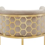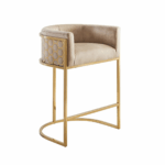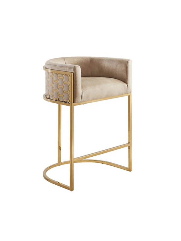 Barski stol Sonia z mehkim bež žametom in elegantnim zlatim okvirjem bo vašemu baru dodal pridih umirjenega razkošja.