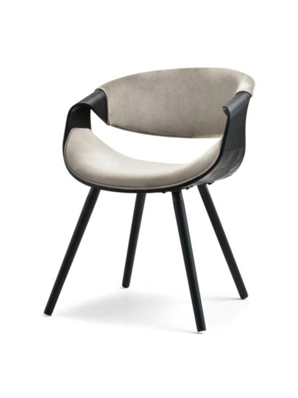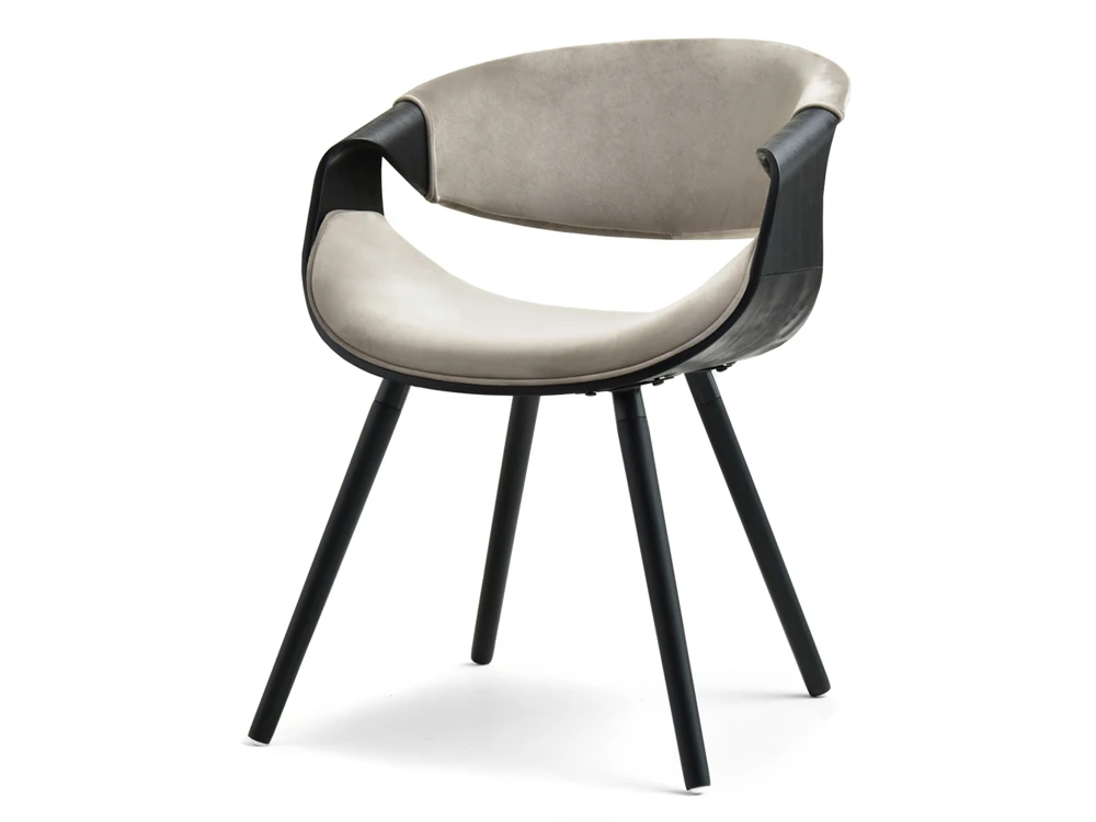 Stol sodobnega dizajna, ki mu daje zanimiv karakter, je izdelan iz kakovostnega ukrivljenega lesa in obložen s prijetno tkanino. Noge so lesene.