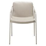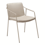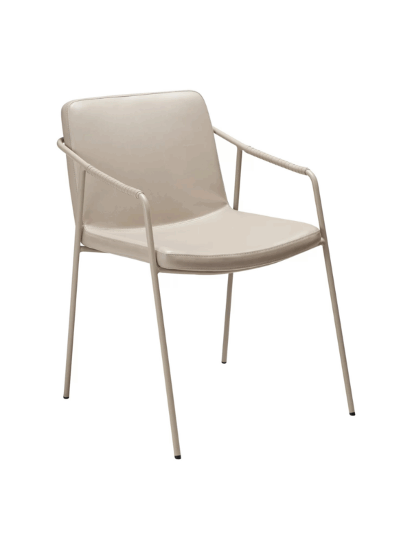 Sjedalo ove stolice tankih metalnih crnih nogu ima mekani tapecirani naslon. Omotač od eko kože oko naslona za ruke ukrasni je detalj koji podiže dizajn na višu razinu. Sjedište i naslon presvučeni su eko kožom cashmere boje.
