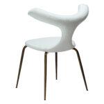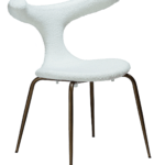 Stol ima močan, a privlačen videz z naslonom, ki spominja na rogovje. Tanke zlate noge so izdelane iz kovine, stol pa je prevlečen z recikliranim buklejem v Off white barvi.