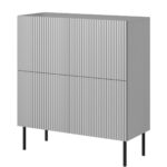 Kvadratna komoda Carmy višine 100 cm in širine 110 cm z reliefnimi letvicami v nežno svetlo sivem odtenku bo spremljala najnovejše trende opremljanja dnevnih sob. 42 cm globok odlagalni prostor je razdeljen na štiri dele, napolnjene z elegantnimi, črtastimi vrati, ki se odlično podajo k drugemu pohištvu iz kolekcije Carmy. S svojimi natančnimi merami se zlahka prilega v poljubno velik prostor.