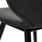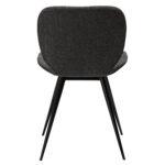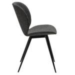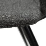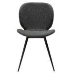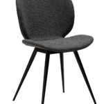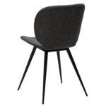 Ta sodoben stol ima preprosto, a osupljivo obliko z zaobljenimi robovi sedeža in elegantnimi, stožčastimi nogami, ki prispevajo k preprostosti dizajna. Stol ima črne noge, medtem ko je naslonjalo prevlečeno s temno sivo tkanino iz bukleja.