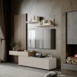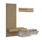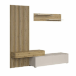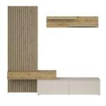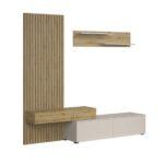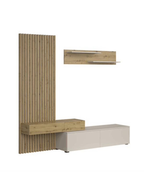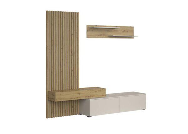 Dnevna regal Monomi je kombinacija elegance in funkcionalnosti, ki bo v vašo notranjost vnesla toplino in sodoben značaj. Naravni odtenek umetniškega hrasta se odlično zlije z nežnim kašmirjem in ustvari harmonično in prijetno kompozicijo. Pohištvo je izdelano iz trpežne 16 mm debele plastificirane plošče, ki zagotavlja vzdržljivost in enostavno vzdrževanje, sodoben sistem odpiranja s pritiskom omogoča odpiranje sprednje strani brez ročajev.