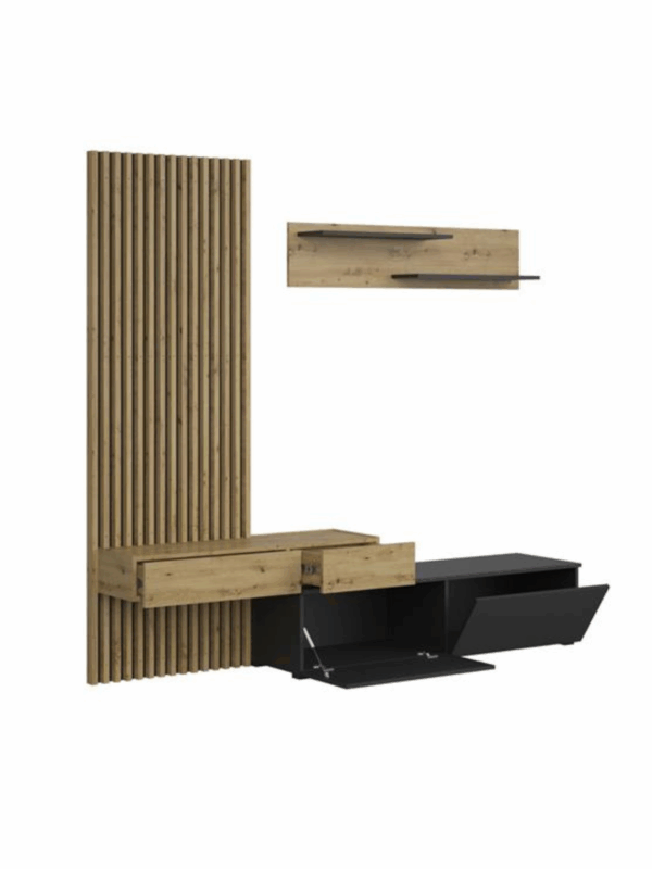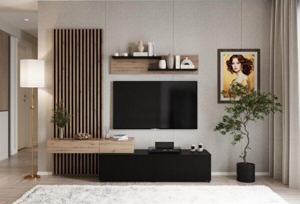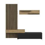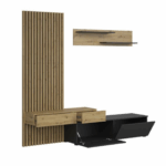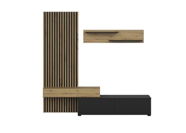 Dnevna garnitura Monomi je kombinacija elegance in funkcionalnosti, ki bo v vašo notranjost vnesla toplino in sodoben značaj. Naravni odtenek umetniškega hrasta se odlično zlije z nežno mat črno barvo in ustvari harmonično in prijetno kompozicijo. Pohištvo je izdelano iz trpežne, 16 mm debele plastificirane plošče, kar zagotavlja vzdržljivost in enostavno vzdrževanje, sodoben sistem odpiranja s pritiskom na gumb pa omogoča odpiranje sprednje strani brez ročajev.
