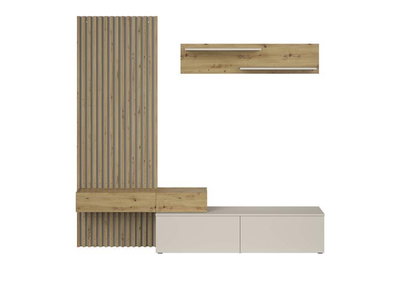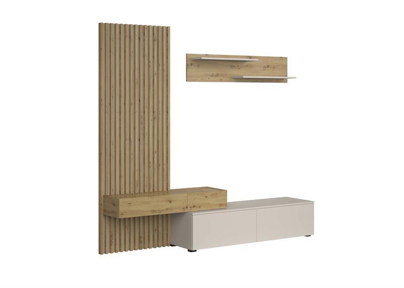 Dnevna regal Monomi je kombinacija elegance in funkcionalnosti, ki bo v vašo notranjost vnesla toplino in sodoben značaj. Naravni odtenek umetniškega hrasta se odlično zlije z nežnim kašmirjem in ustvari harmonično in prijetno kompozicijo. Pohištvo je izdelano iz trpežne 16 mm debele plastificirane plošče, ki zagotavlja vzdržljivost in enostavno vzdrževanje, sodoben sistem odpiranja s pritiskom omogoča odpiranje sprednje strani brez ročajev.