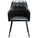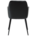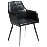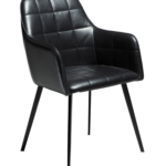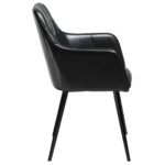 Stol ima mehke ukrivljene naslone za roke, ki zagotavljajo klasičen in eleganten videz. Okrasni šivi na notranji strani naslonjala, držala in sedeža dodajo pridih elegance, udoben sedež pa ga naredi kot idealen stol. Sedež je oblečen v vintage črno eko usnje, kovinske noge pa so črne.