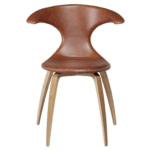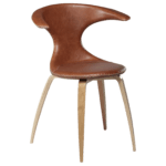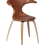 Ta stol združuje sodoben, luksuzen in nordijski stil z udobjem. Njegov sedež je oblazinjen v svetlo rjavem usnju, hrastove noge pa so v naravni barvi.