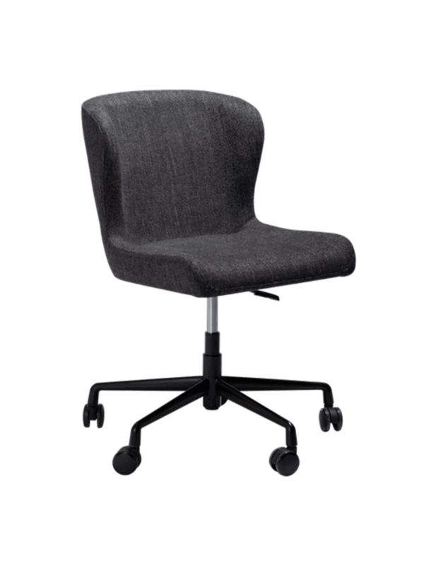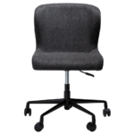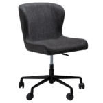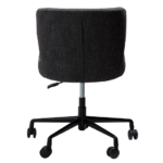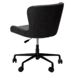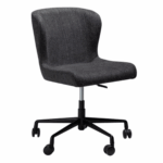 Pisarniški stol izžareva eleganco s kraljevskim vtisom mehko oblikovanega sedeža iz črnega bukle blaga. Podnožje tega stola je črne barve in ima 5 koles, ki omogočajo prosto gibanje po prostoru.