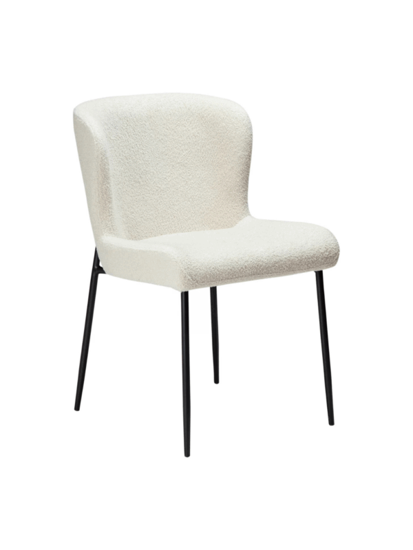 Ta stol izžareva eleganco s kraljevskim vtisom mehko oblikovanega sedeža iz snežno belega recikliranega bukleja in vitkih črnih kovinskih nog.