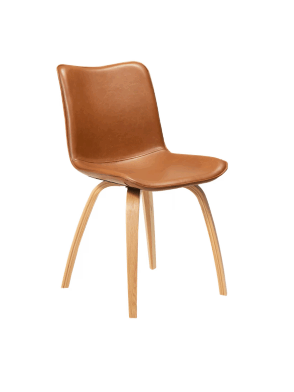 Ta stol izžareva živahnost z ukrivljenim hrbtnim naslonjalom in sedežem, oblazinjenim v vintage svetlo rjavem ekološkem usnju. Njegove furnirane hrastove noge dodatno poudarjajo zanimiv dizajn.