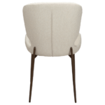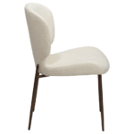 Ukrivljen naslon tega stola ga naredi zanimivega. Sedež in naslonjalo sta prekrita z belim buklejem in stojita na starinskih kovinskih nogah v barvi medenine.