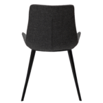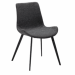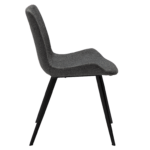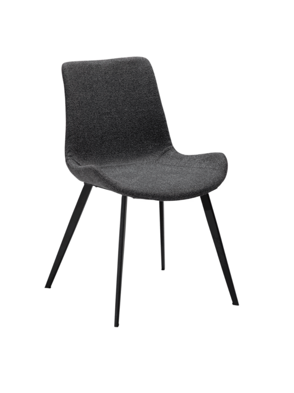Stol izstopa s svojo značilno obliko sedeža z detajli, kot so šivi. Stol je prevlečen s sivo tkanino iz bukleja in stoji na črnih kovinskih nogah.