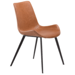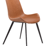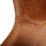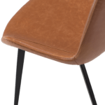 Stol izstopa s svojo značilno obliko sedeža z detajli, kot so šivi. Stol je oblečen v svetlo rjavo vintage eko usnje in stoji na črnih kovinskih nogah.