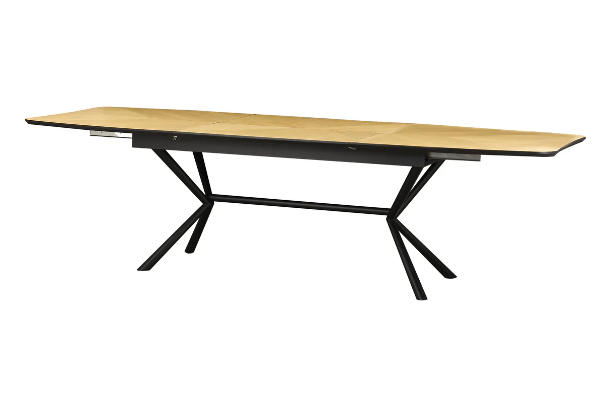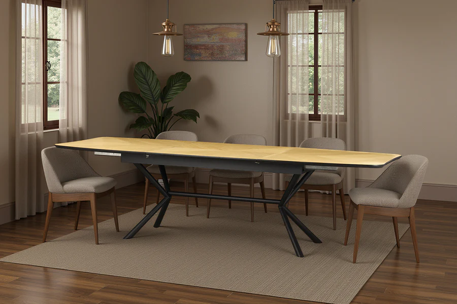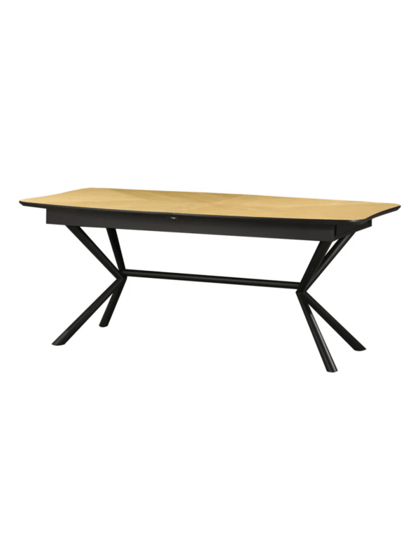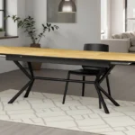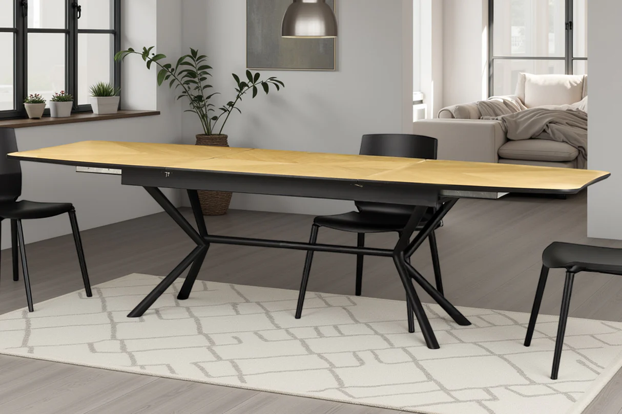 Jedilna miza Apollo združuje tople orehovske tone z robustnim črnim okvirjem, kar vašemu prostoru daje tako stil kot prilagodljivost.