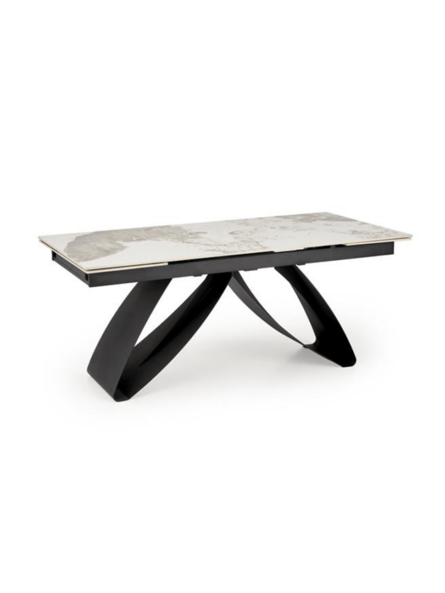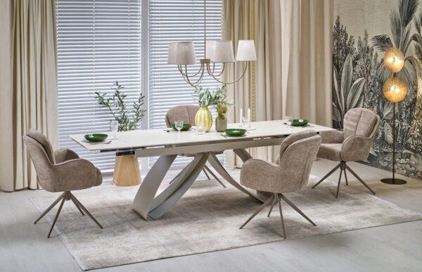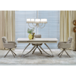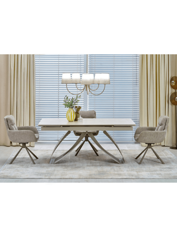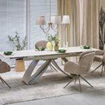 Jedilna miza Hilary bo osvežila vaš bivalni prostor s svojo zložljivo strukturo, ki jo sestavlja popolna mešanica sintranega kamna v svetli travertinski barvi in elegantno podnožje iz prašno barvanega kašmirskega jekla.