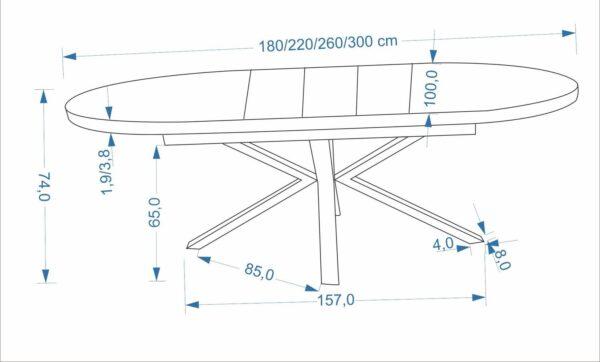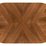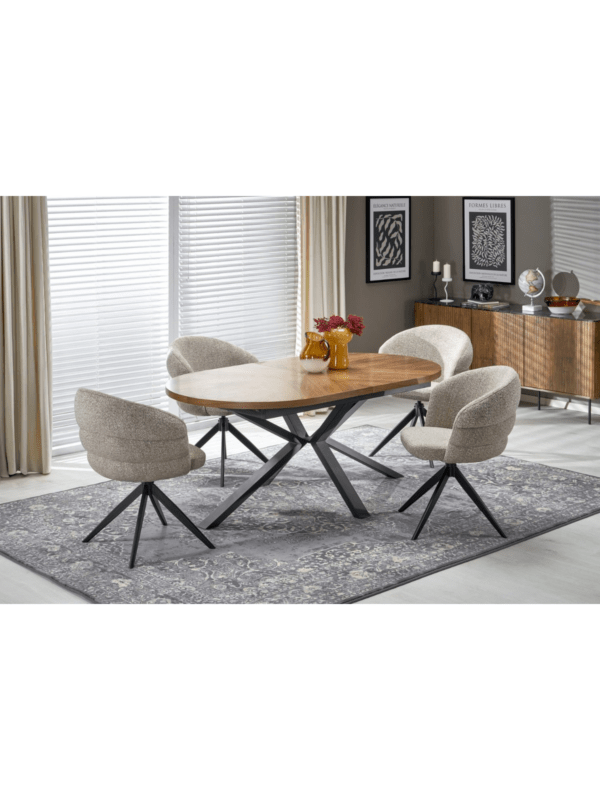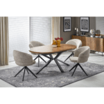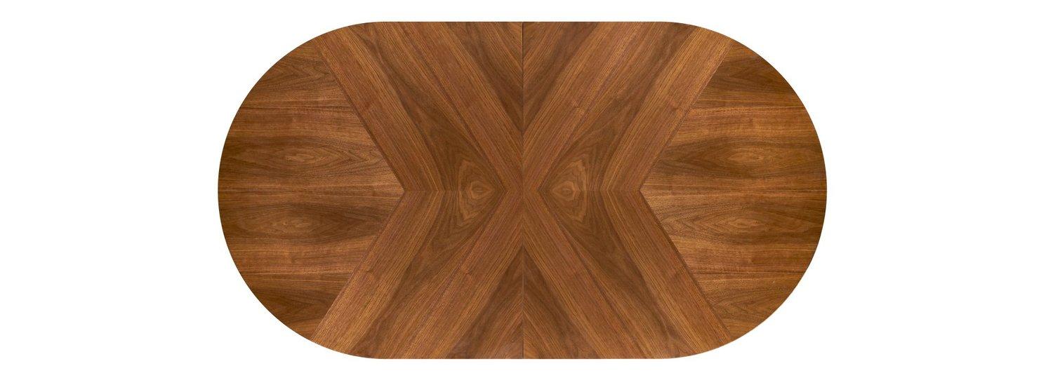 Lorian stol je produžni stol s ovalnom pločom koji kombinira eleganciju klasičnog drva s modernim dizajnerskim dodirom. Ploča stola izrađena je od MDF-a s toplim furnirom oraha i ukrašena intarzijama, što površini daje suptilan, dekorativni uzorak i naglašava prirodni karakter drva.