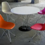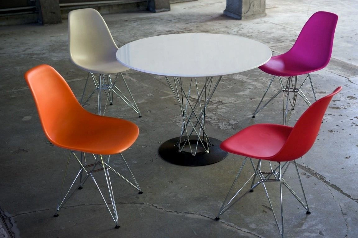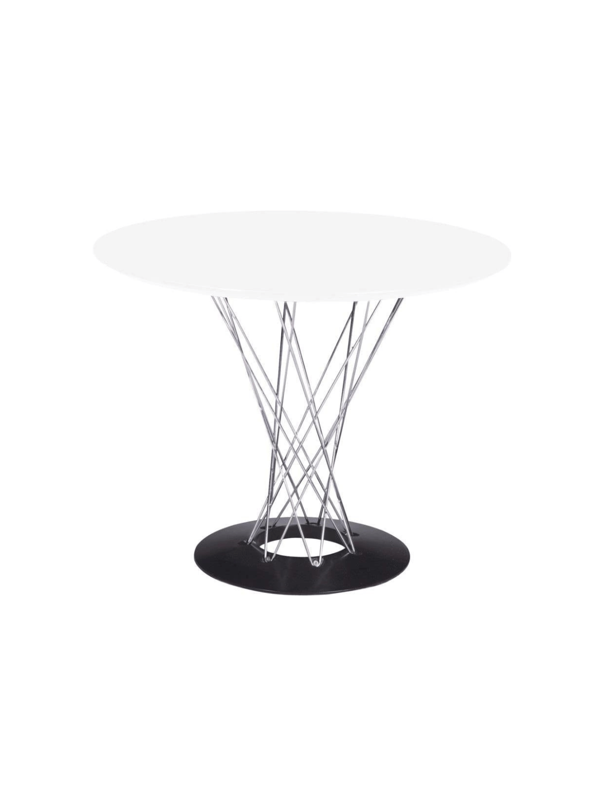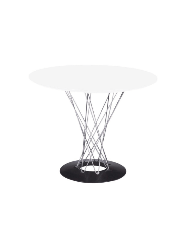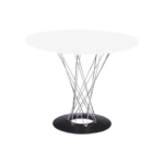 Jedilna miza Plexus ima značilno podnožje iz jeklene žice s kromiranim zaključkom.