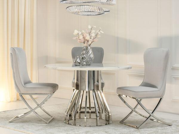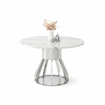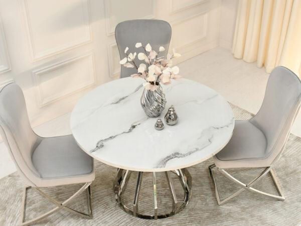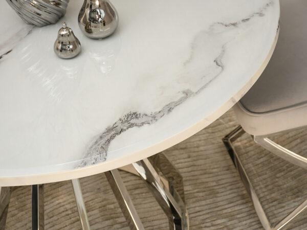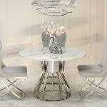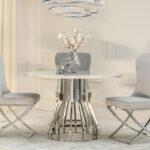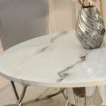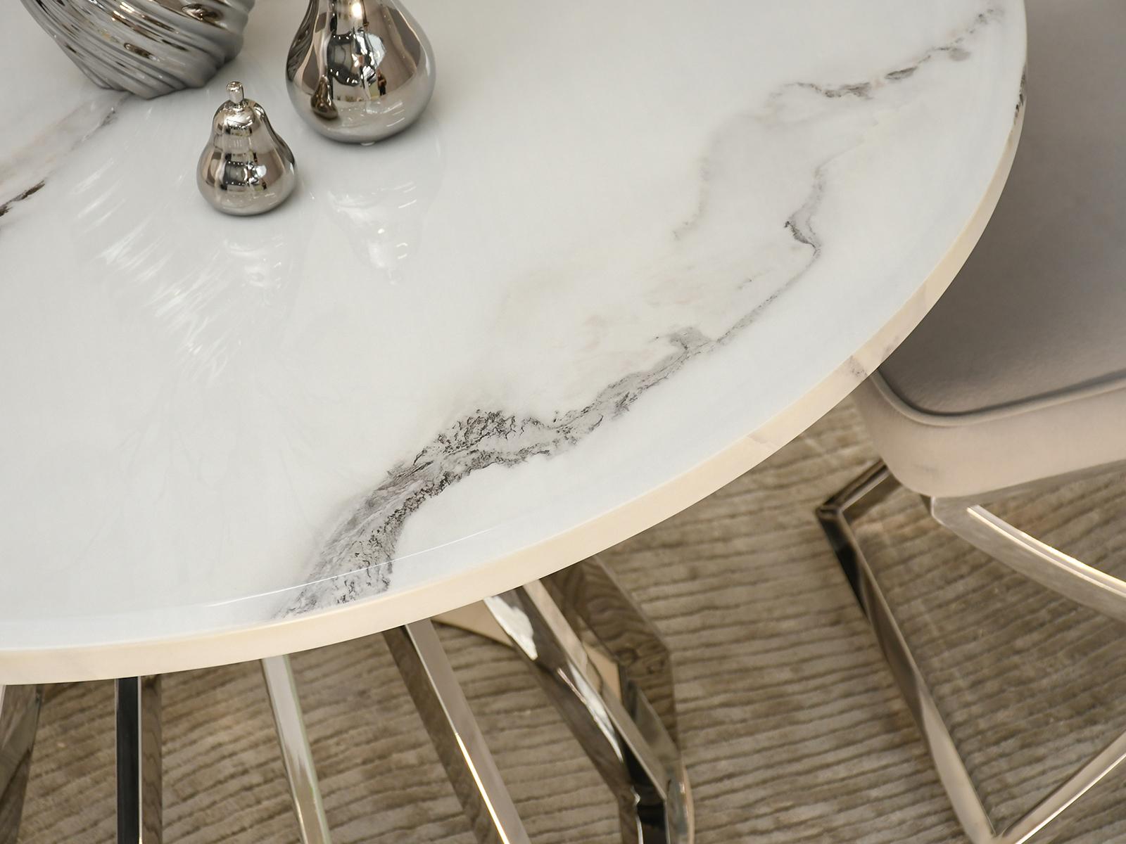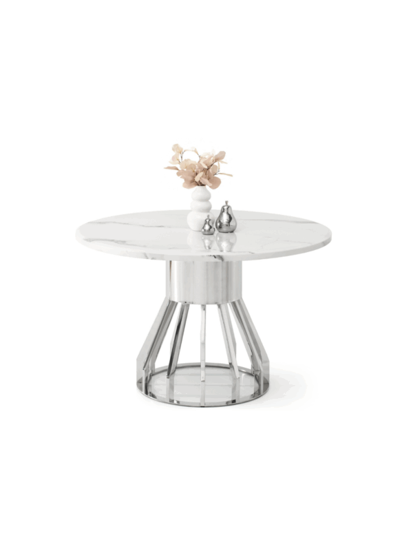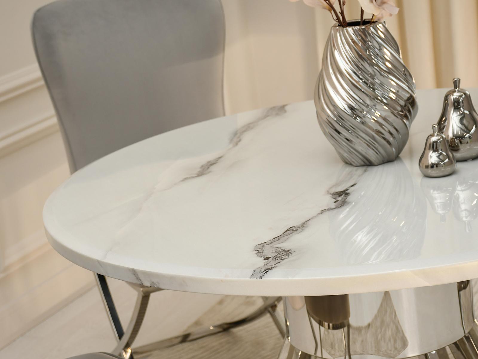 Jedilna miza Tanatos je eleganten kos pohištva, ki bo popoln tako v vaši domači jedilnici kot v sodobni restavraciji. Njena okrogla bela marmorna plošča v kombinaciji z bleščečim kromiranim podnožjem ustvarja razkošen in brezčasen dizajn. V dnevni sobi bo miza postala osrednja točka za druženje ob obrokih ali klepet z najdražjimi.