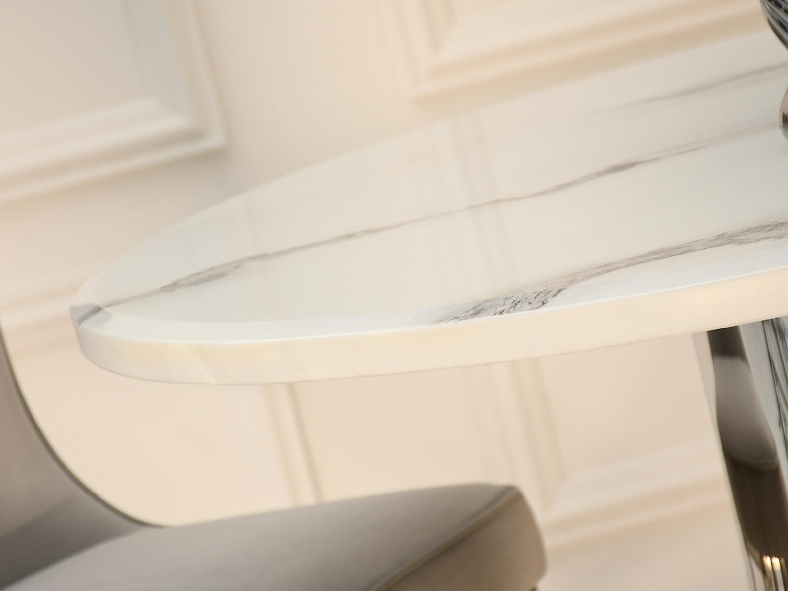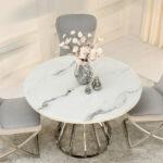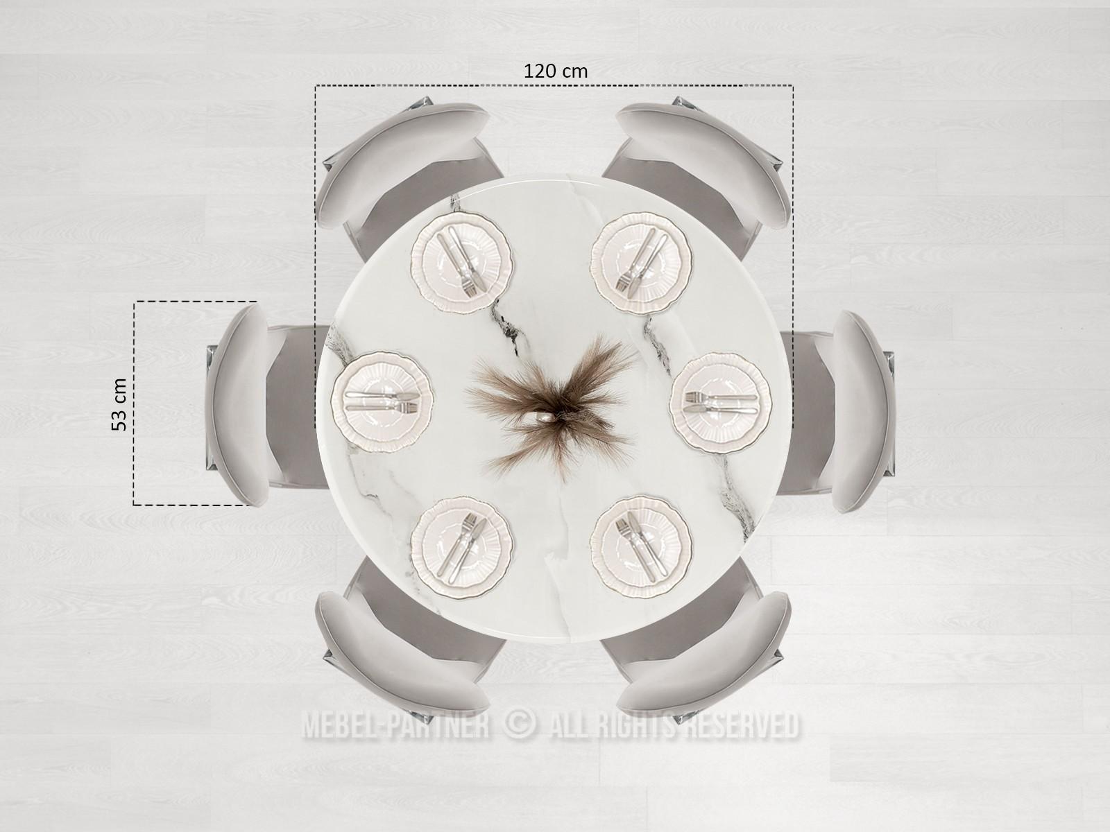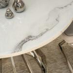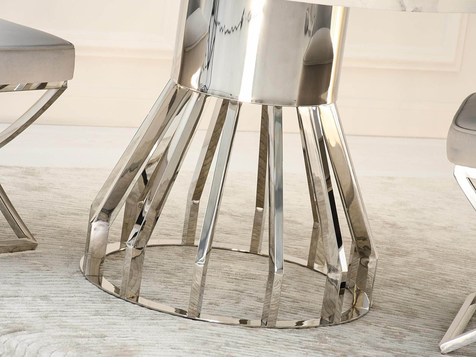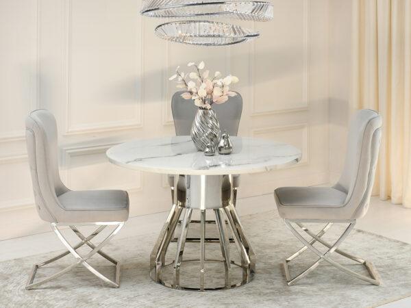 Jedilna miza Tanatos je eleganten kos pohištva, ki bo popoln tako v vaši domači jedilnici kot v sodobni restavraciji. Njena okrogla bela marmorna plošča v kombinaciji z bleščečim kromiranim podnožjem ustvarja razkošen in brezčasen dizajn. V dnevni sobi bo miza postala osrednja točka za druženje ob obrokih ali klepet z najdražjimi.