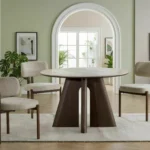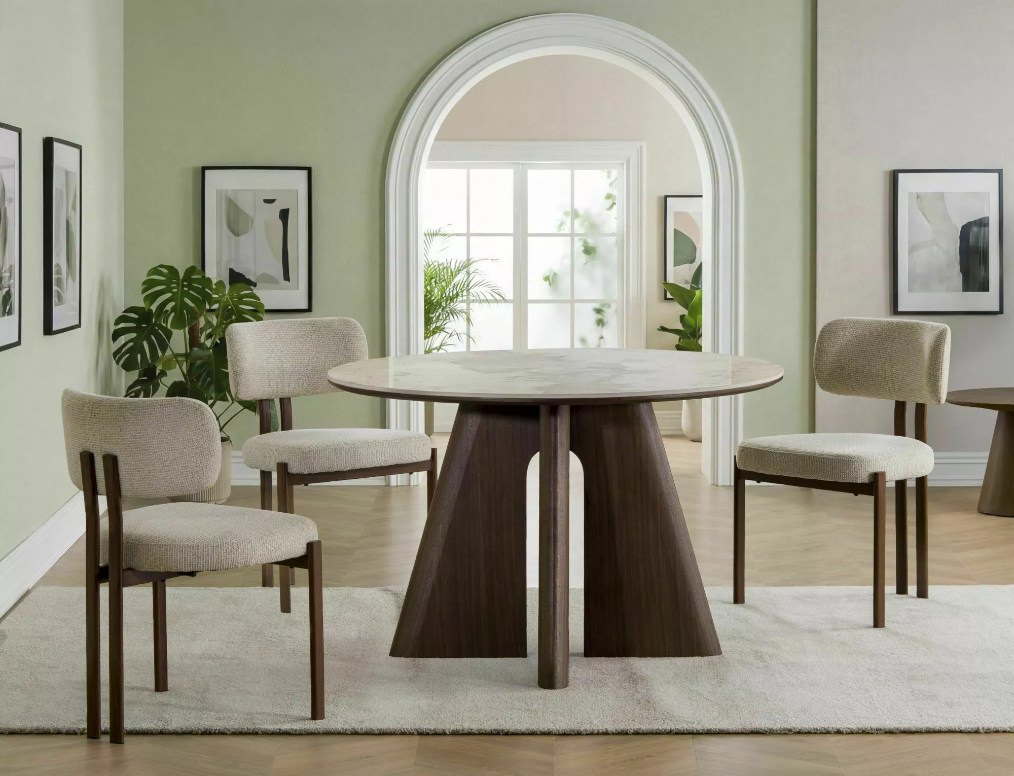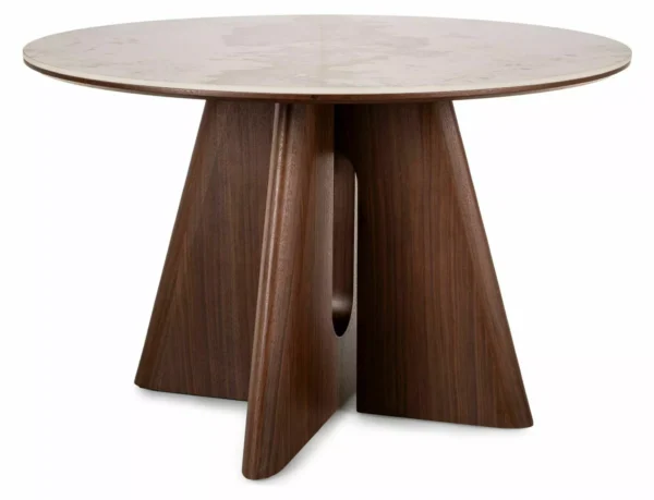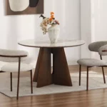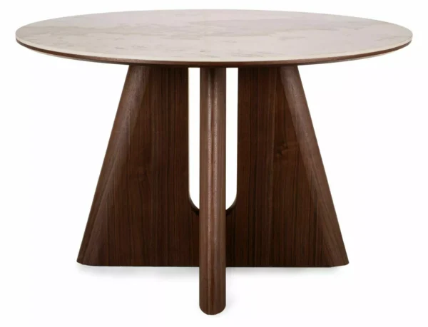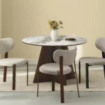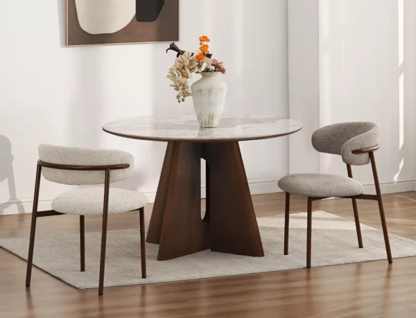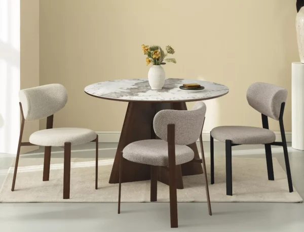 Jedilna miza Vancouver združuje prefinjeno estetiko s funkcionalnostjo in ustvarja prostor za vsakodnevna druženja. Okrogla plošča mize poudarja lahkotnost aranžmaja in omogoča naravno vzdušje domačnosti in sproščenega pogovora. Podstavek iz MDF, prevlečen z naravnim furnirjem, zagotavlja trdnost in celovit celoten videz.
