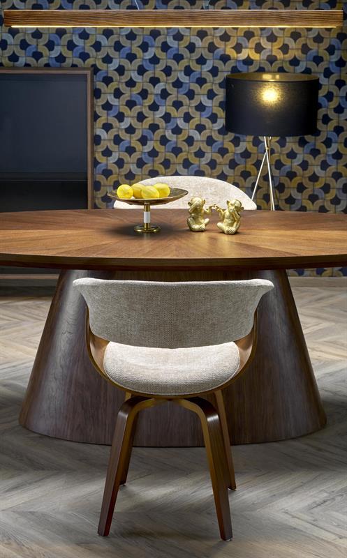 Jedilna miza Vener iz naravnega furnirja v barvi oreha bo v vaš prostor vnesla prijetno, toplo vzdušje. Osupljiv krožnik ovalne oblike ustvarja harmonično kompozicijo s stožčastimi nogami.