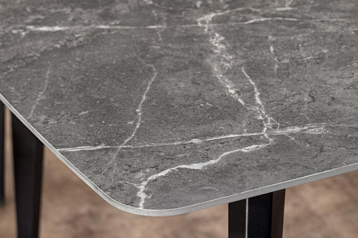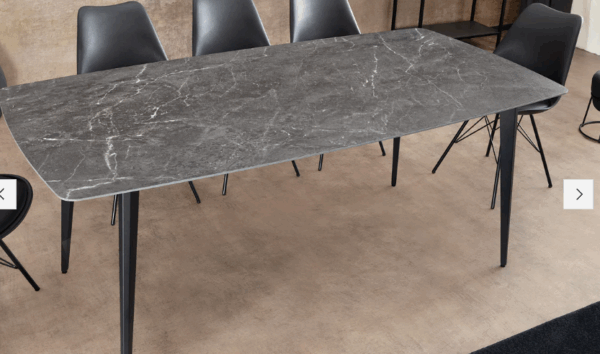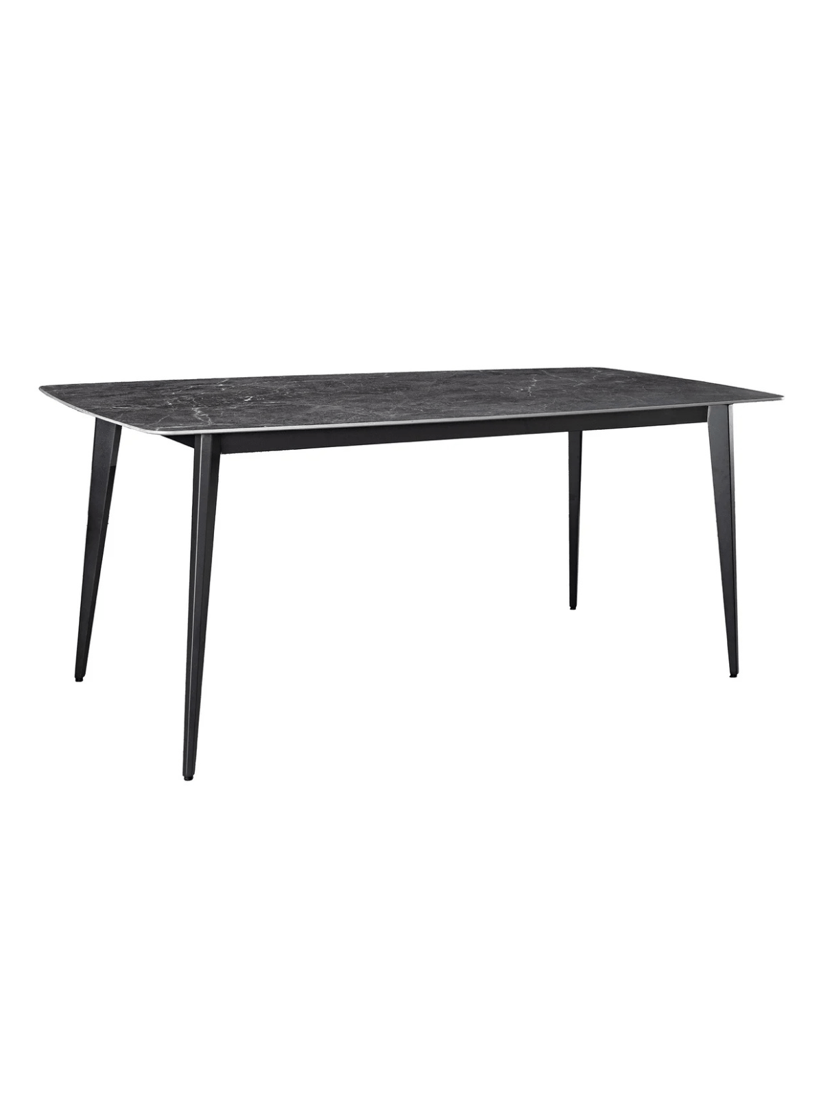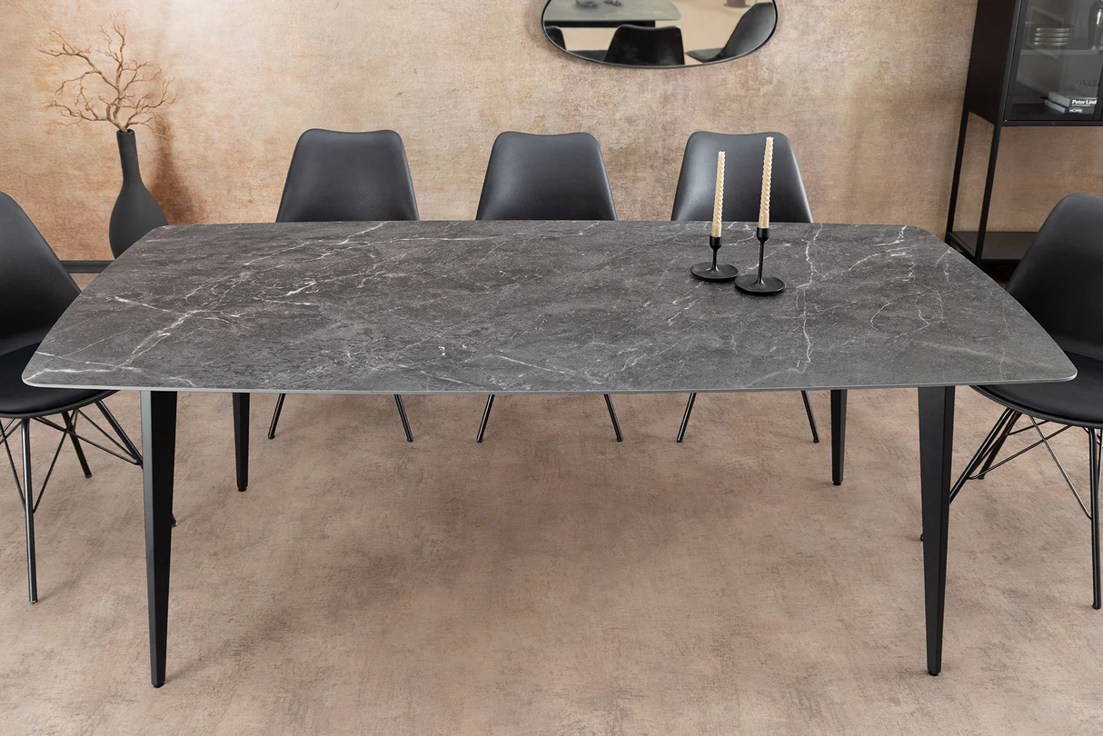 Dodajte svoji jedilnici sodoben in prefinjen pridih z mizo Verlain. Z dimenzijami 160 x 90 cm lahko sprejme do 8 gostov v udobnem in prefinjenem okolju. Matiran zaključek keramične plošče poudarja temne odtenke antracita, kovinske noge pa zagotavljajo popolno stabilnost.