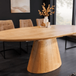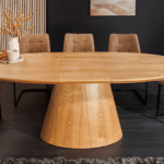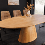 Jedilna miza Vies je izdelana iz MDF plošče, prekrite s čudovitim hrastovim furnirjem, kar ji daje vzdržljivost in prefinjen videz. Edinstveno podnožje je izdelano iz istega materiala kot plošča in zagotavlja stabilnost.