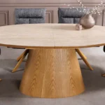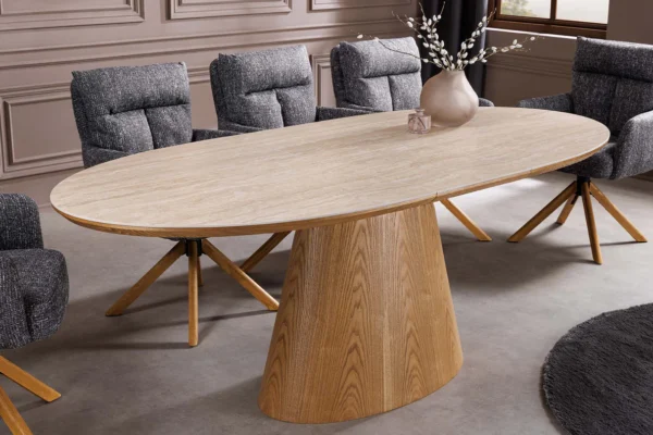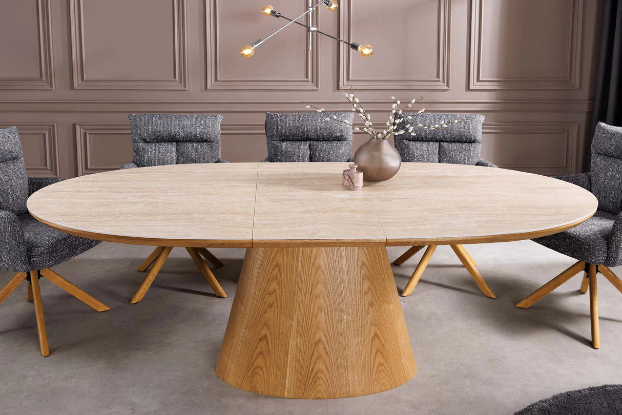 V svojo jedilnico vnesite stil in vsestranskost z mizo Vies – raztegljivo mizo, ki združuje elegantno keramiko z videzom marmorja in detajle iz toplega hrasta. Trpežna, elegantna in pripravljena za vsako druženje, je popolna za vsakodnevne obroke ali formalne večerje.