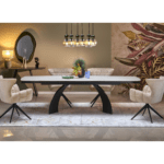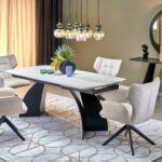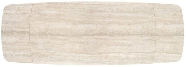 Raztegljiva jedilna miza Benjamin je moderna jedilna miza, ki združuje elegantno obliko z visoko funkcionalnostjo. Njena posebnost je dekorativno podnožje – noge iz prašno barvanega jekla v barvi kašmirja, spletene v presenetljivo obliko loka. Mizna plošča, izdelana iz keramike na steklu v bež marmorni barvi, ima subtilen vzorec kamna, ki notranjosti doda eleganten in brezčasen značaj.