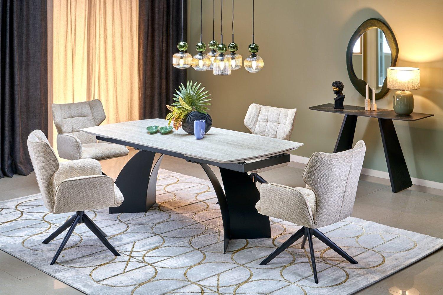 Raztegljiva jedilna miza Benjamin je moderna jedilna miza, ki združuje elegantno obliko z visoko funkcionalnostjo. Njena posebnost je dekorativno podnožje – noge iz prašno barvanega jekla v barvi kašmirja, spletene v presenetljivo obliko loka. Mizna plošča, izdelana iz keramike na steklu v bež marmorni barvi, ima subtilen vzorec kamna, ki notranjosti doda eleganten in brezčasen značaj.