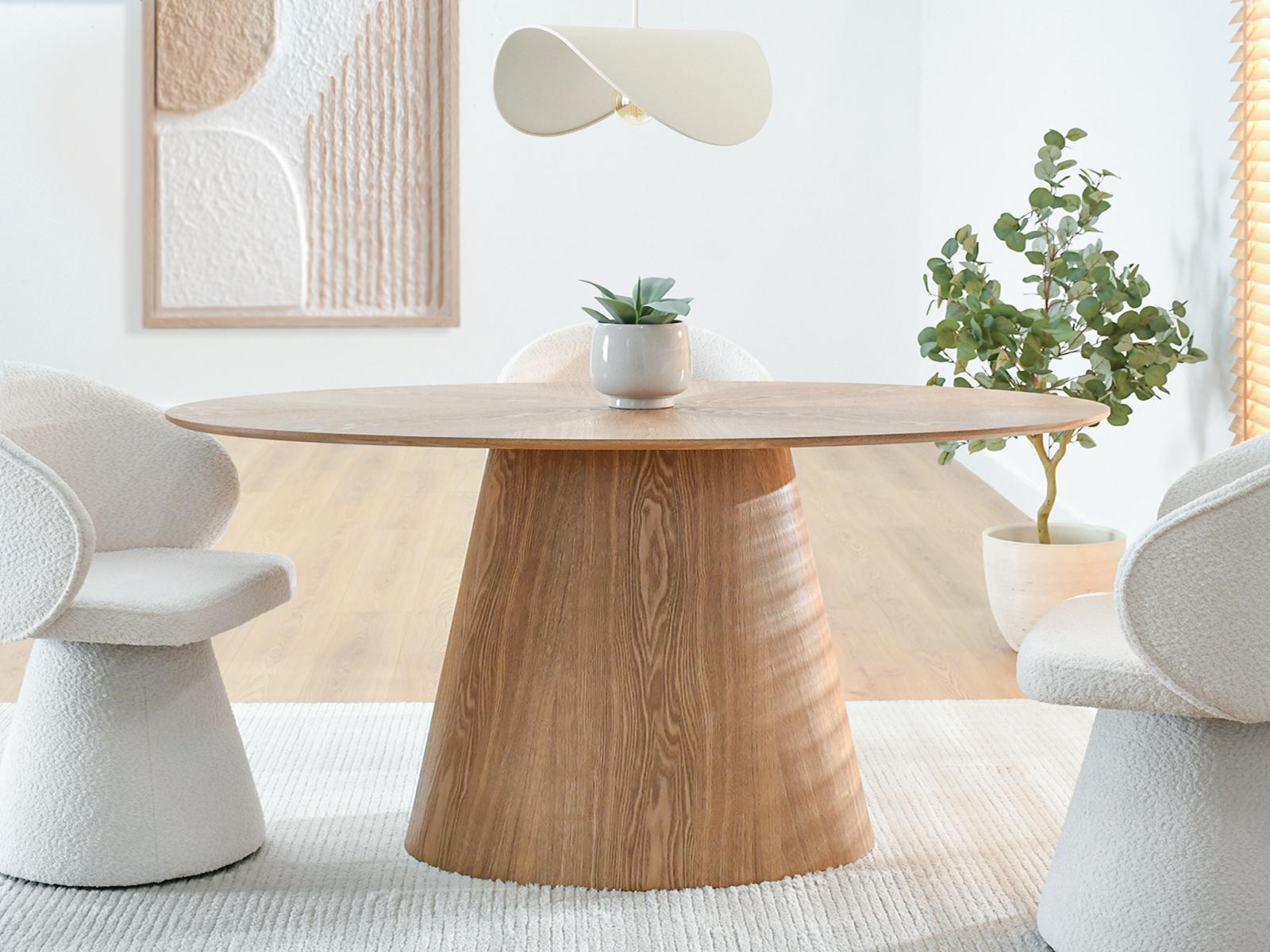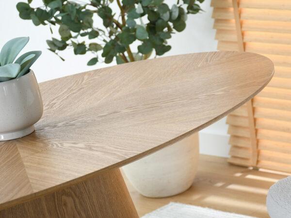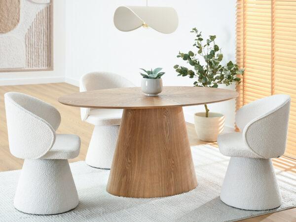 Jedilna miza Zafira izstopa z ovalno obliko in elegantno ploščo v barvi naravnega hrasta. Zaradi stabilnega podstavka v obliki stožca je idealna izbira za tiste, ki cenite minimalističen stil in visoko kakovost izdelave pri dekoraciji jedilnice ali dnevne sobe.