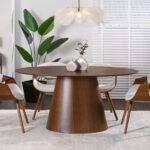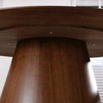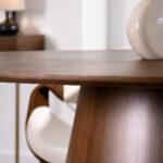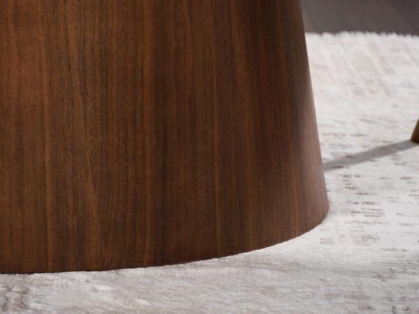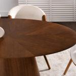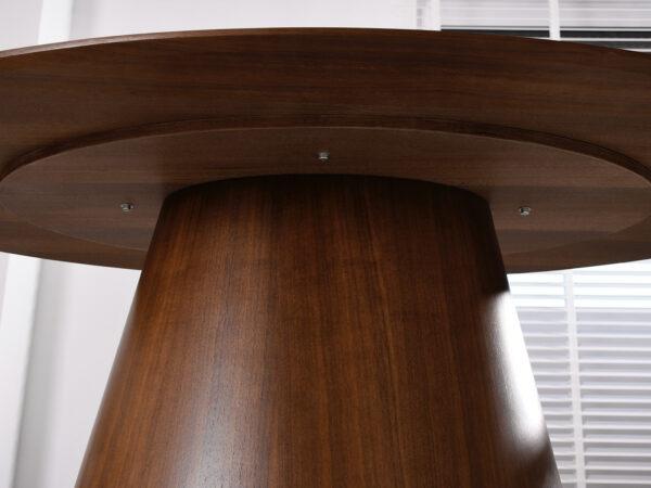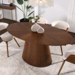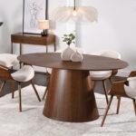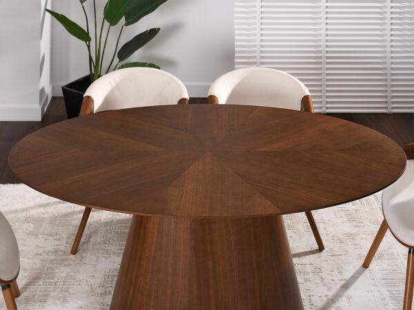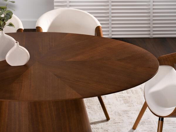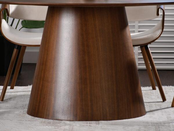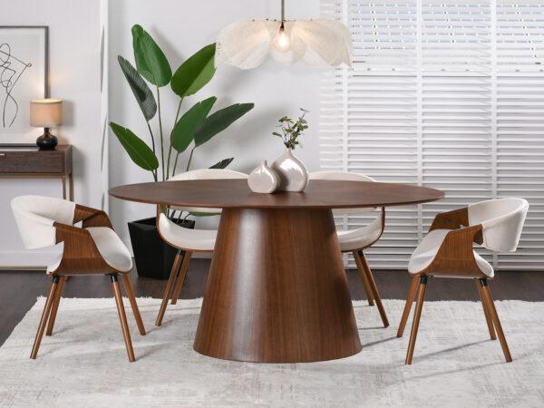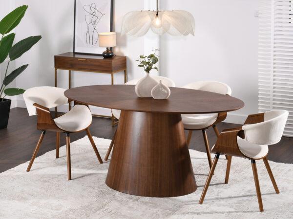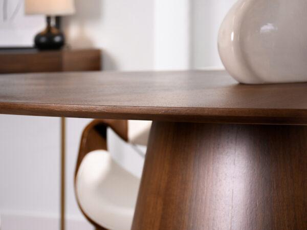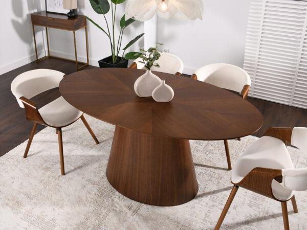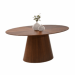 Jedilna miza Zafira izstopa s svojo ovalno obliko in elegantno površino v bogatem orehovem odtenku. Stabilno stožčasto podnožje jo naredi idealno izbiro za tiste, ki cenijo minimalističen slog in visokokakovostno izdelavo v svoji jedilnici ali dnevni sobi.
