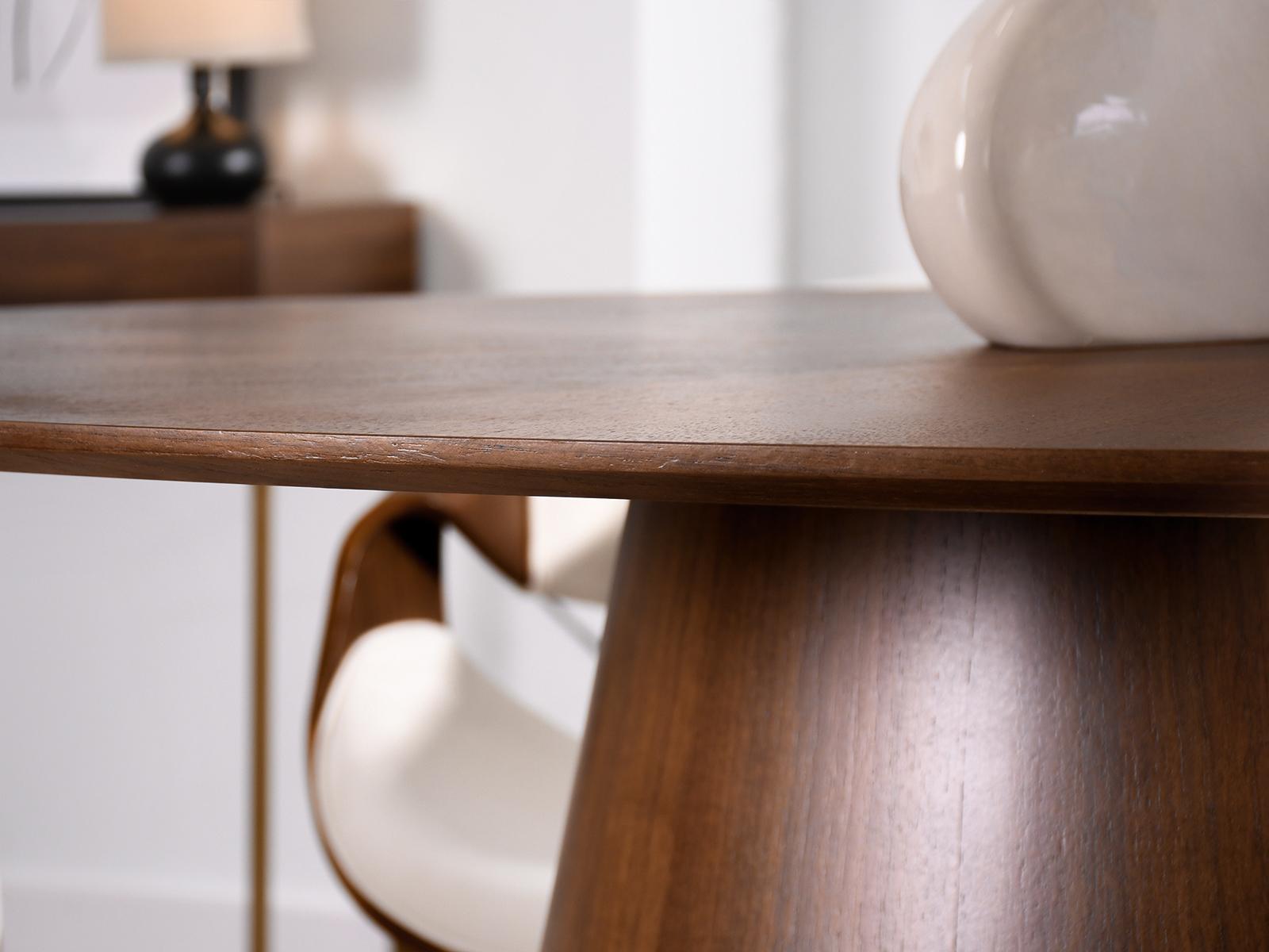 Jedilna miza Zafira izstopa s svojo ovalno obliko in elegantno površino v bogatem orehovem odtenku. Stabilno stožčasto podnožje jo naredi idealno izbiro za tiste, ki cenijo minimalističen slog in visokokakovostno izdelavo v svoji jedilnici ali dnevni sobi.