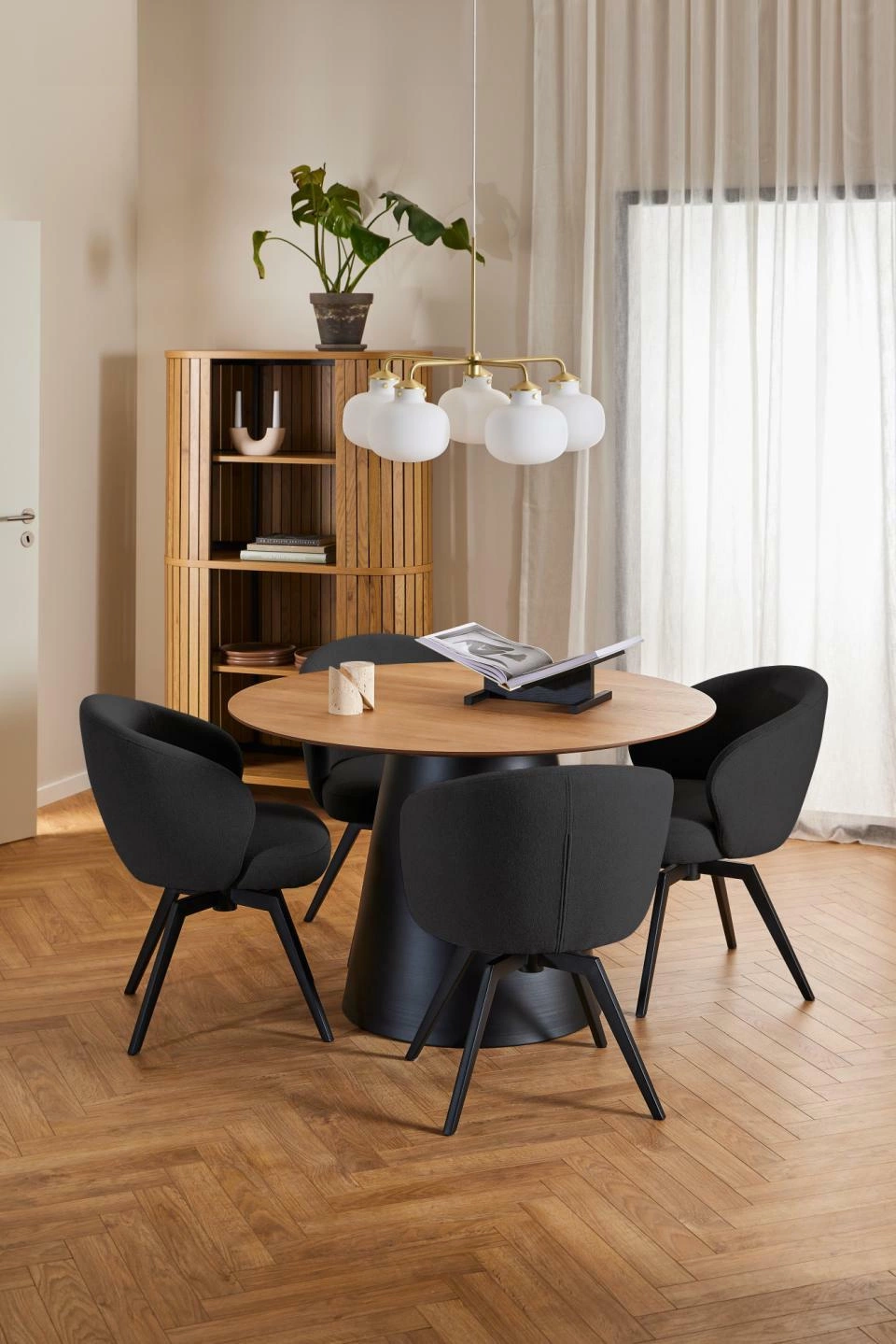 Vnesite pridih prefinjenosti v svoj dom z jedilnim stolom Tieni, kjer se udobje sreča s sodobnim dizajnom. Potopite se v sedež z žepkastimi vzmetmi in uživajte v svobodi vrtenja s podpornimi nasloni za roke za izboljšano izkušnjo sedenja.