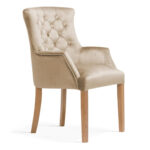 Oblazinjen fotelj z visokim naslonjalom. Naslonjalo ima plitke diamantne šive z gumbom na notranji strani. Z izbiro barve materiala ga boste lažje prilagodili preostalemu prostoru.