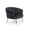 Fotelj z elegantnim dizajnom ovit v udoben žamet, na zlatih nogah, ki vnašajo slog in poudarjajo lepoto prostora in samega fotelja.