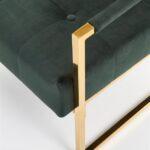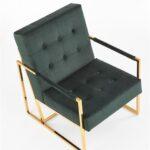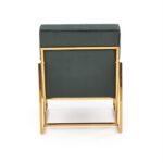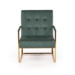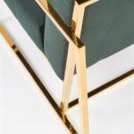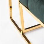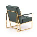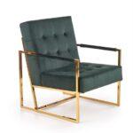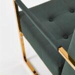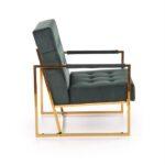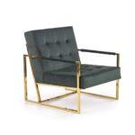Fotelj z elegantnim dizajnom in ravnimi linijami ovit v udoben žamet , z zlatim okvirom, ki vnaša slog in poudarja lepoto prostora in samega fotelja.