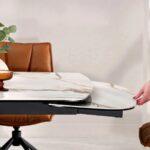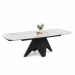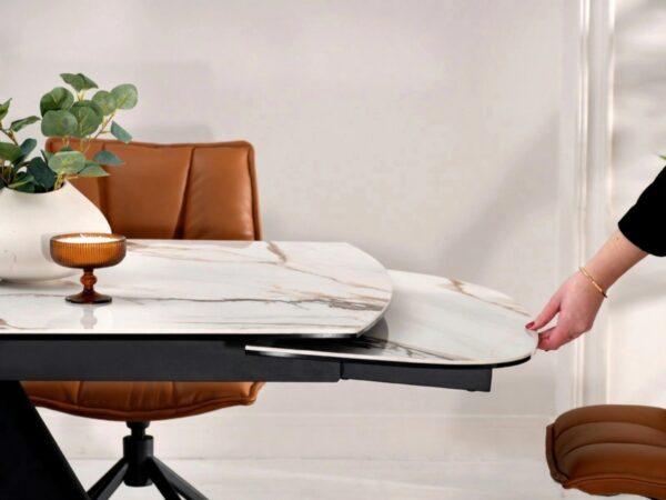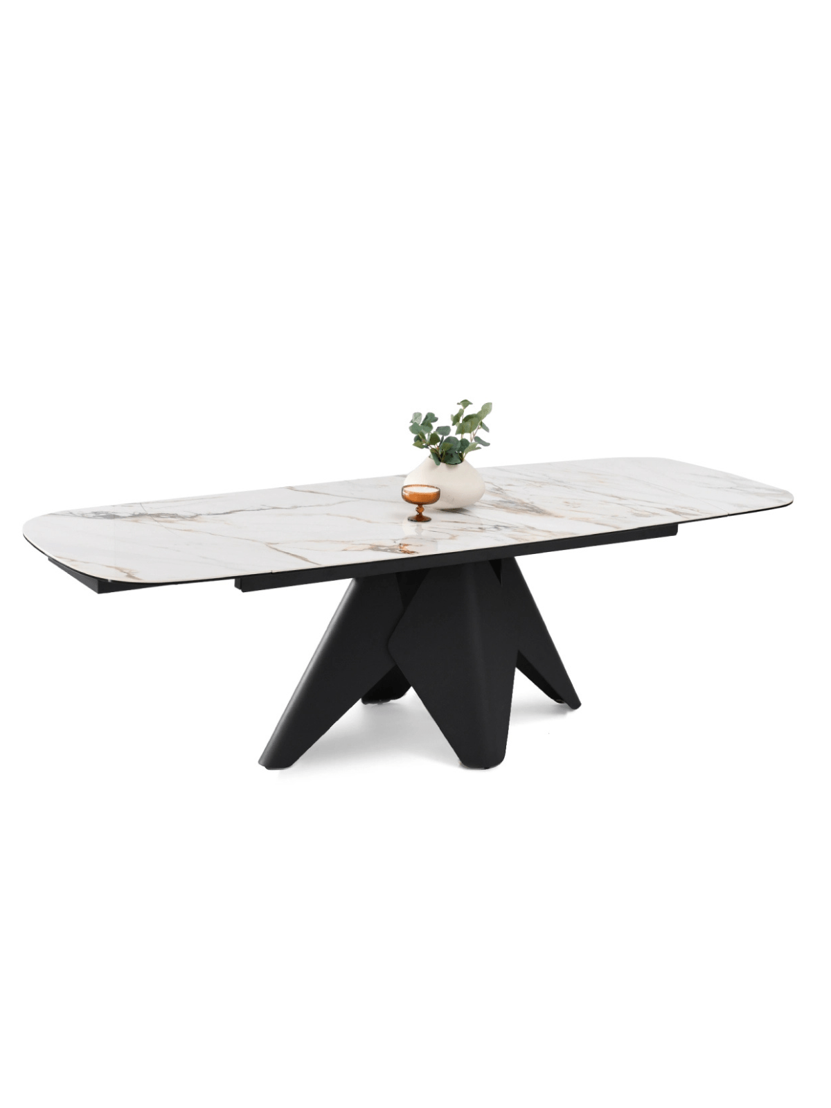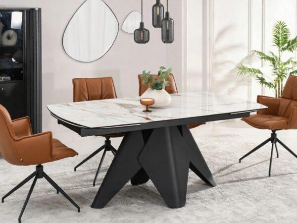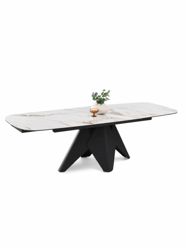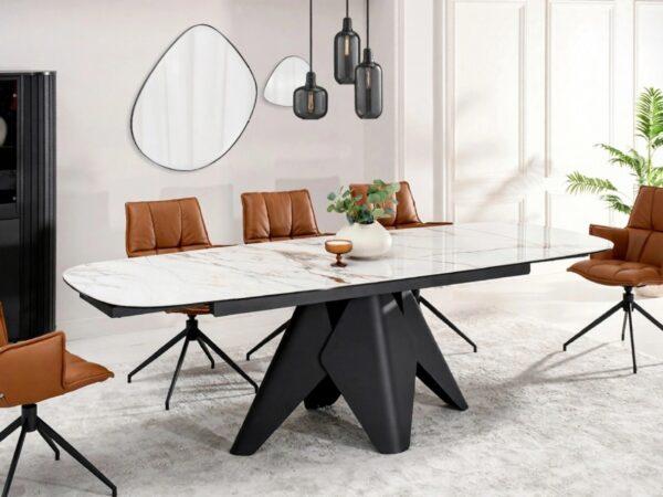Jedilna miza Adler izstopa predvsem po svojem praktičnem mehanizmu za razteg, ki omogoča razteg mizne plošče na 260 cm, kar zagotavlja prostor za do 10 oseb. Mizna plošča je izdelana iz visokokakovostne keramike z učinkom bež marmorja Calacatta, ki zagotavlja izjemno vzdržljivost in odpornost proti praskam, edinstveno črno kovinsko podnožje pa zagotavlja stabilnost in trdnost. Natančna izdelava in pozornost do detajlov naredita Adler kos pohištva, ki bo trajal leta in ohranil svoj čar tudi ob intenzivni uporabi.