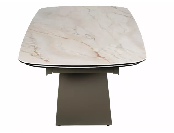 Raztegljiva miza sodobnega dizajna je izdelana iz visokokakovostnih materialov, ki zagotavljajo vzdržljivost in eleganco. Plošča mize združuje kaljeno steklo in keramiko Mont Blanc, kar zagotavlja odpornost na praske, vročino in vsakodnevno uporabo. Stabilno kovinsko podnožje v bakrenem odtenku daje prefinjen videz in dodatno trdnost. Je idealna izbira za sodobne jedilnice, ki iščejo kombinacijo funkcionalnosti in razkošnega sloga.
