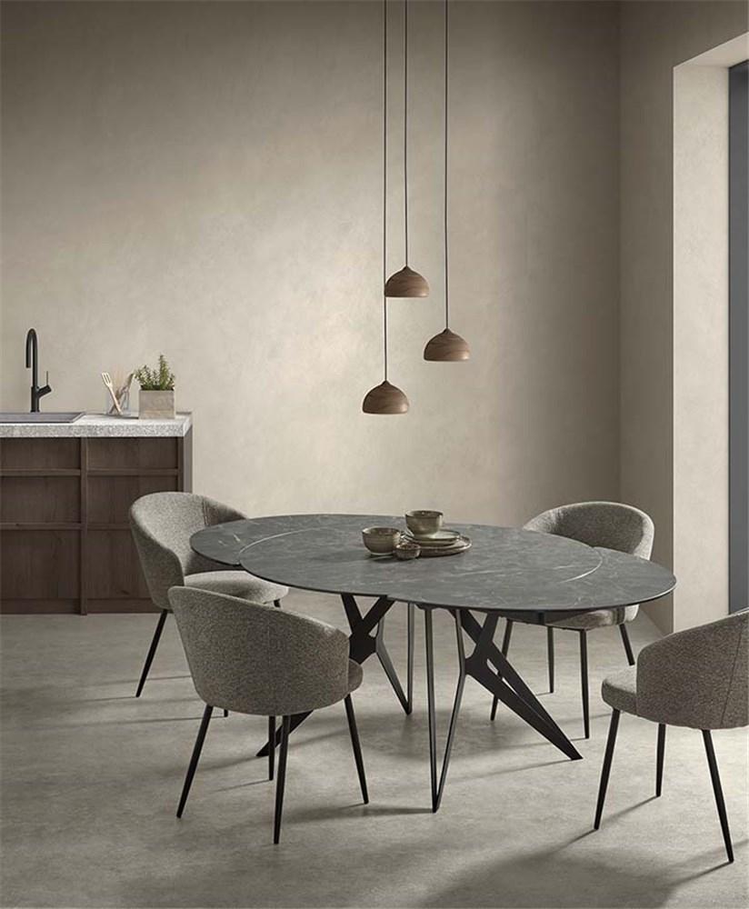 Raztegljiva jedilna miza Boleta združuje elegantno obliko s funkcionalnostjo in vzdržljivostjo. Keramična mizna plošča ponuja razkošen videz, hkrati pa je odporna na praske, toploto in enostavna za čiščenje. Trdne kovinske noge zagotavljajo stabilno podlago in dajejo mizi industrijski videz. Zahvaljujoč raztegljivemu mehanizmu lahko mizo enostavno raztegnete in ustvarite dodaten prostor za goste ali posebne priložnosti.