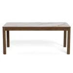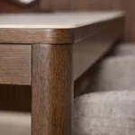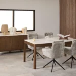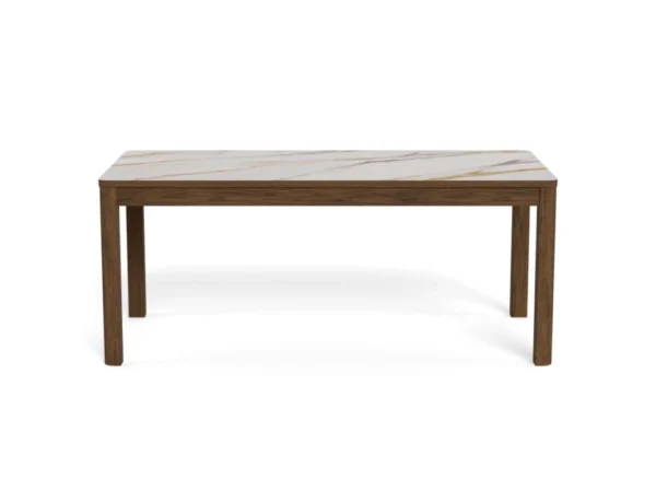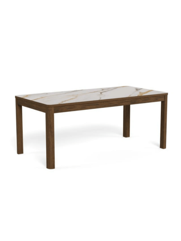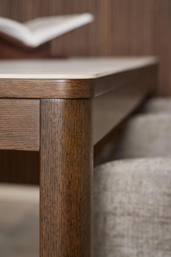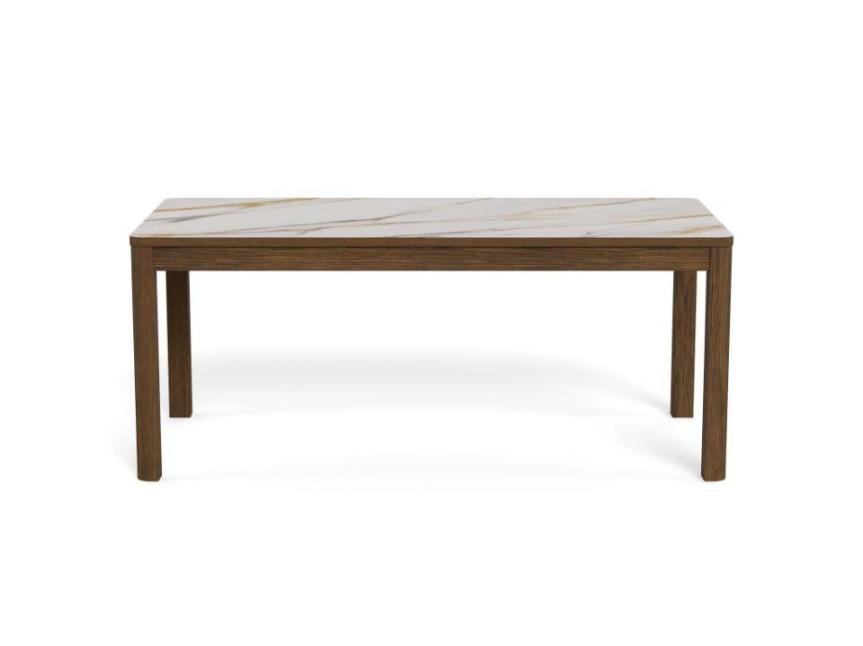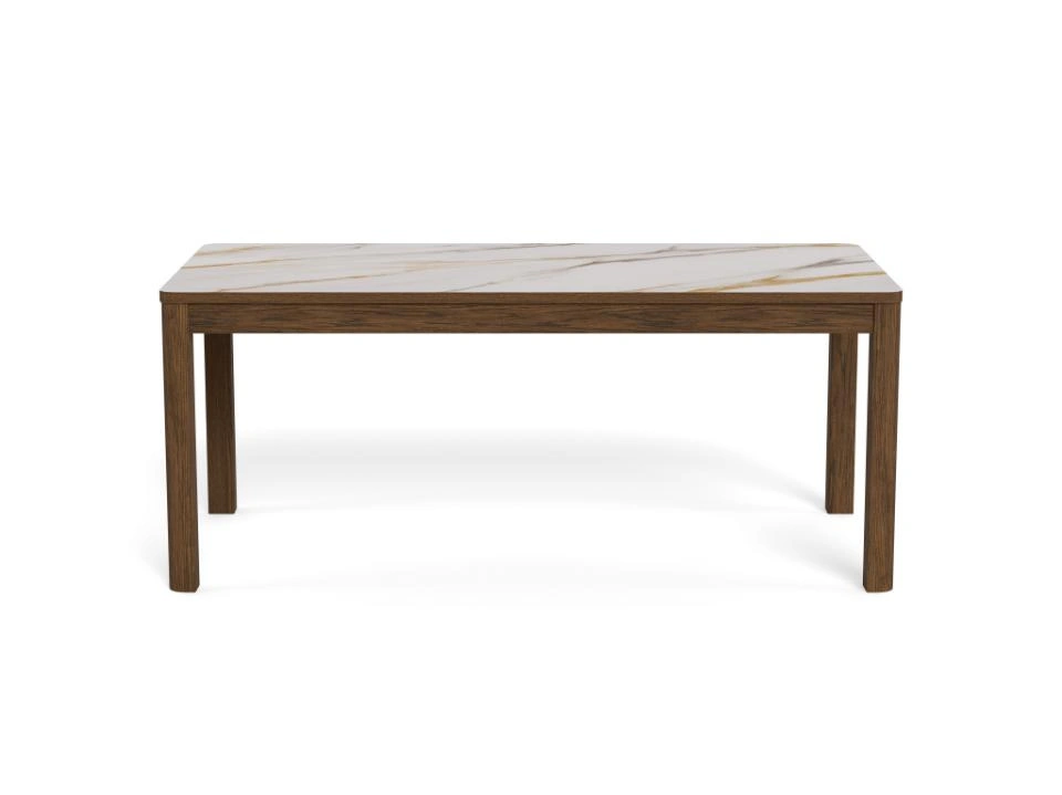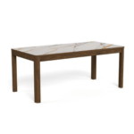 Jedilna miza Chiara bo s svojim preprostim, a elegantnim dizajnom dopolnila jedilnice z lesenimi elementi. Podstavek iz temnega hrastovega furnirja se harmonično dopolnjuje s keramično ploščo z rjavimi žilami, kar prostoru daje toplino.