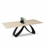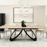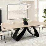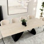 Jedilna miza Eskil je odlična izbira za ljubitelje modernega oblikovanja. Očara ne le s svojo silhueto, temveč tudi z bež keramično površino, ki subtilno spominja na naravni travertin. Njeno edinstveno, dekorativno podnožje doda pridih lahkotnosti in ustvari edinstven poudarek v prostoru. Zahvaljujoč možnosti raztegljivosti je mizo mogoče enostavno prilagoditi za večje število gostov.