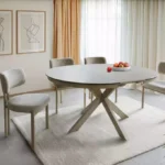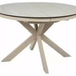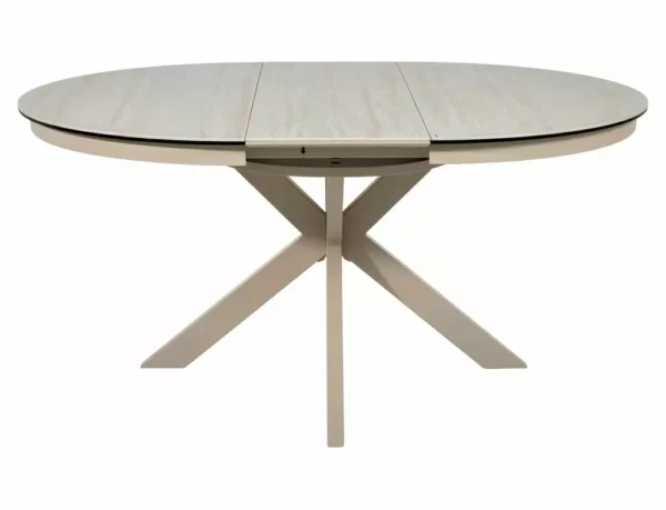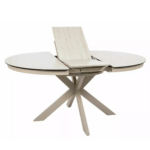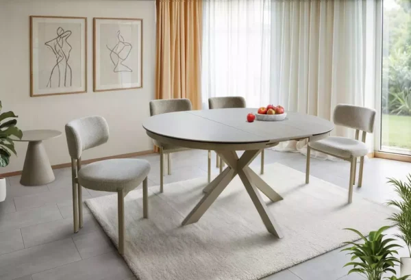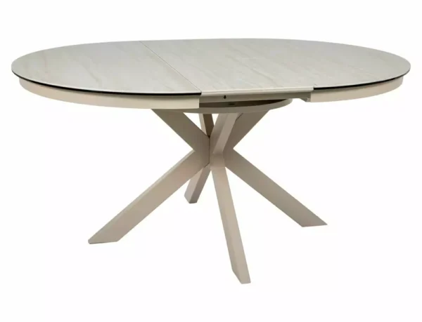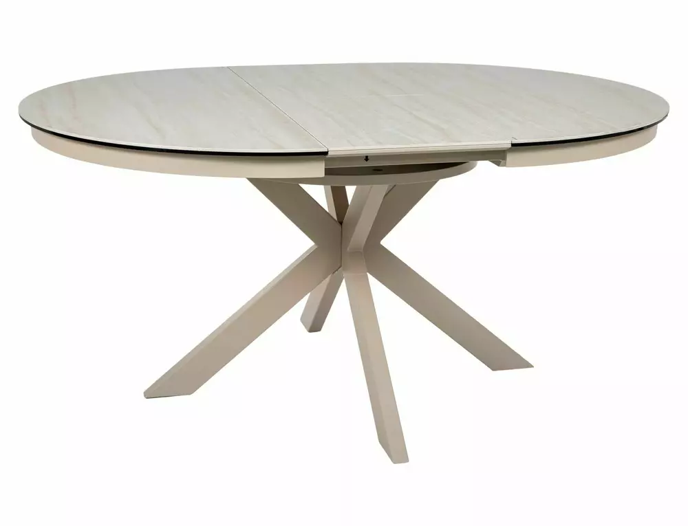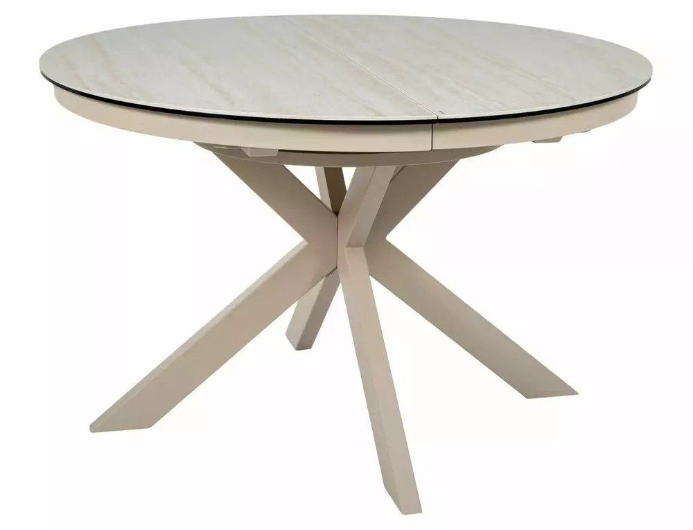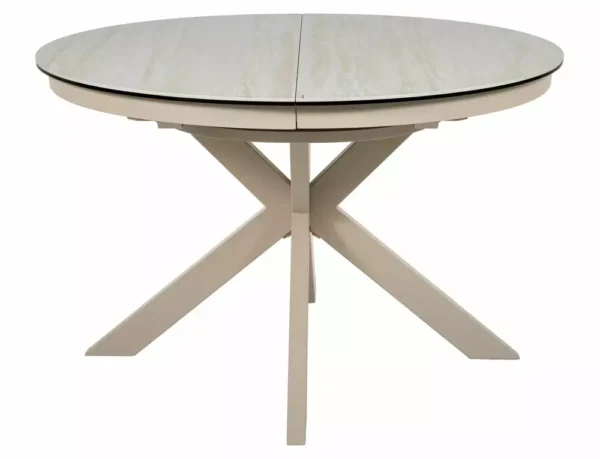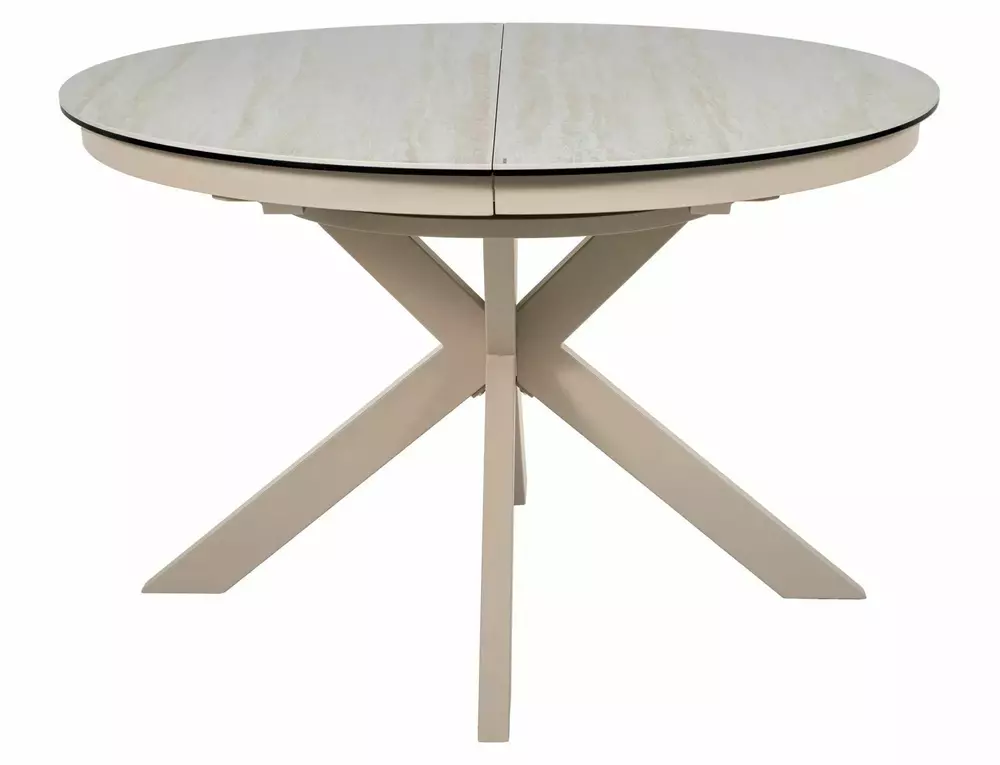 Jedilna miza Port je izdelana iz dvoslojne plošče, sestavljene iz španske keramike in kaljenega stekla. Mizna plošča je okrogle oblike s premerom 120 cm in se lahko raztegne do 160 cm. Osnova je kovinska in v kombinaciji s ploščo daje mizi izjemno trdnost. Podstavek je v obliki križa, keramična plošča z učinkom travertina pa bo odlična izbira za ljubitelje modernih interierjev.