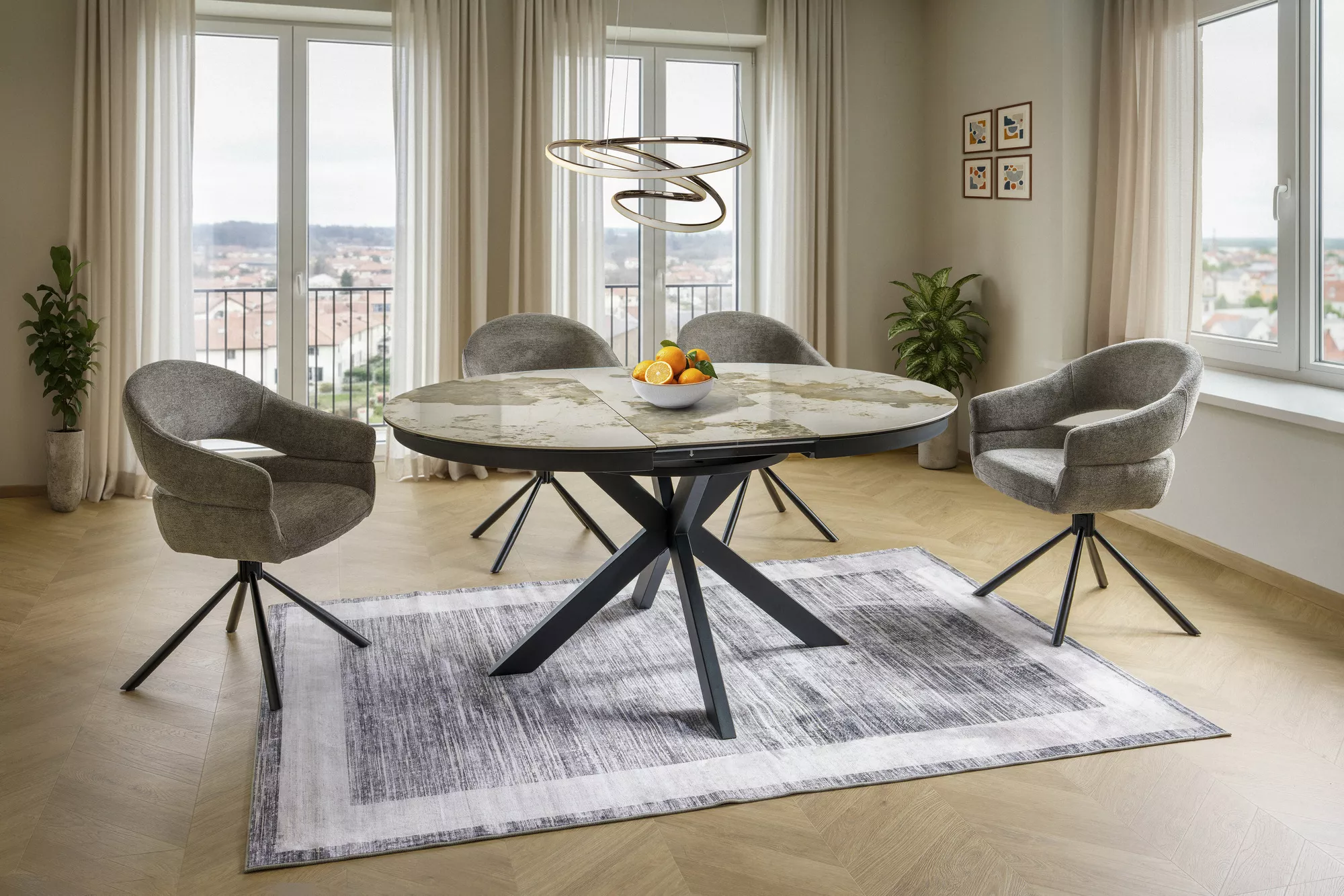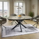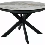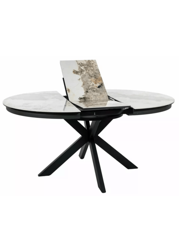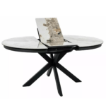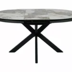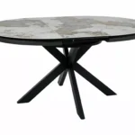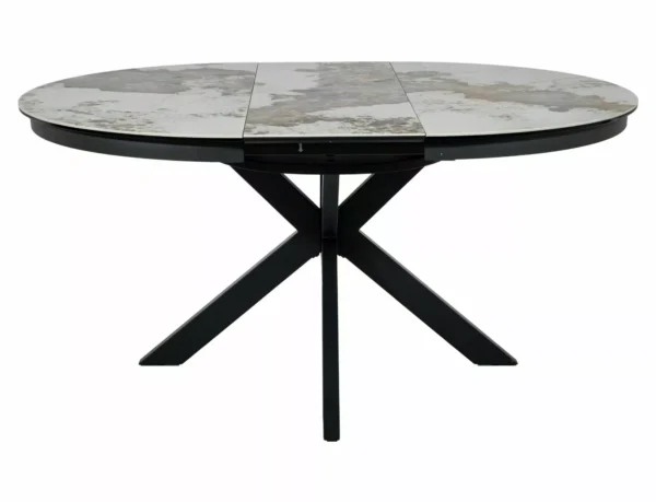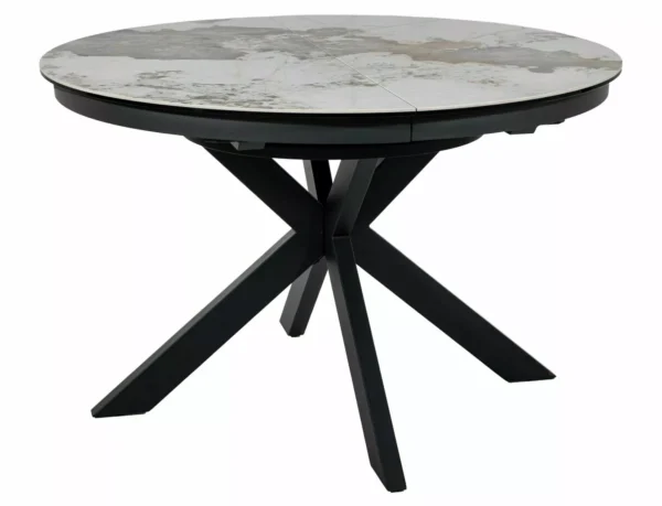 Jedilna miza Port je izdelana iz dvoslojne plošče, sestavljene iz španske keramike in kaljenega stekla. Mizna plošča je okrogle oblike s premerom 120 cm in se lahko raztegne do 160 cm. Osnova je kovinska in v kombinaciji s ploščo daje mizi izjemno trdnost. Podstavek je v obliki križa, keramična plošča z efektom mramorja pa bo odlična izbira za ljubitelje modernih interierjev.