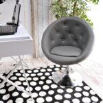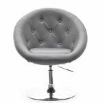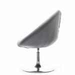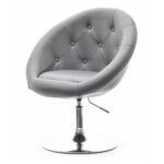Elegantno oblikovan fotelj v kombinaciji jekla in žameta z nastavljivo višino in možnostjo rotacije.