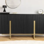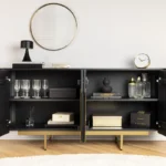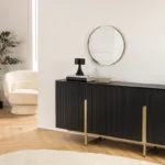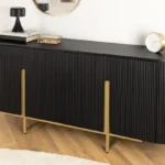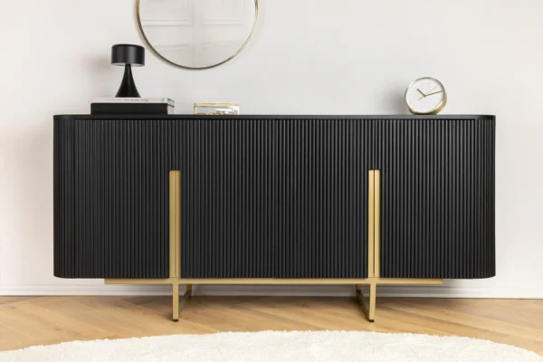 Združite retro čar in sodoben glamur s komodo Armas, elegantnim modelom, ki je hkrati praktičen in privlačen. Bogata obdelava mangovega lesa in drzni zlati detajli ustvarjajo popolno mešanico vintage stila in sodobnega pridiha za vsako sobo.